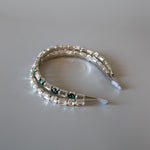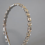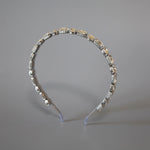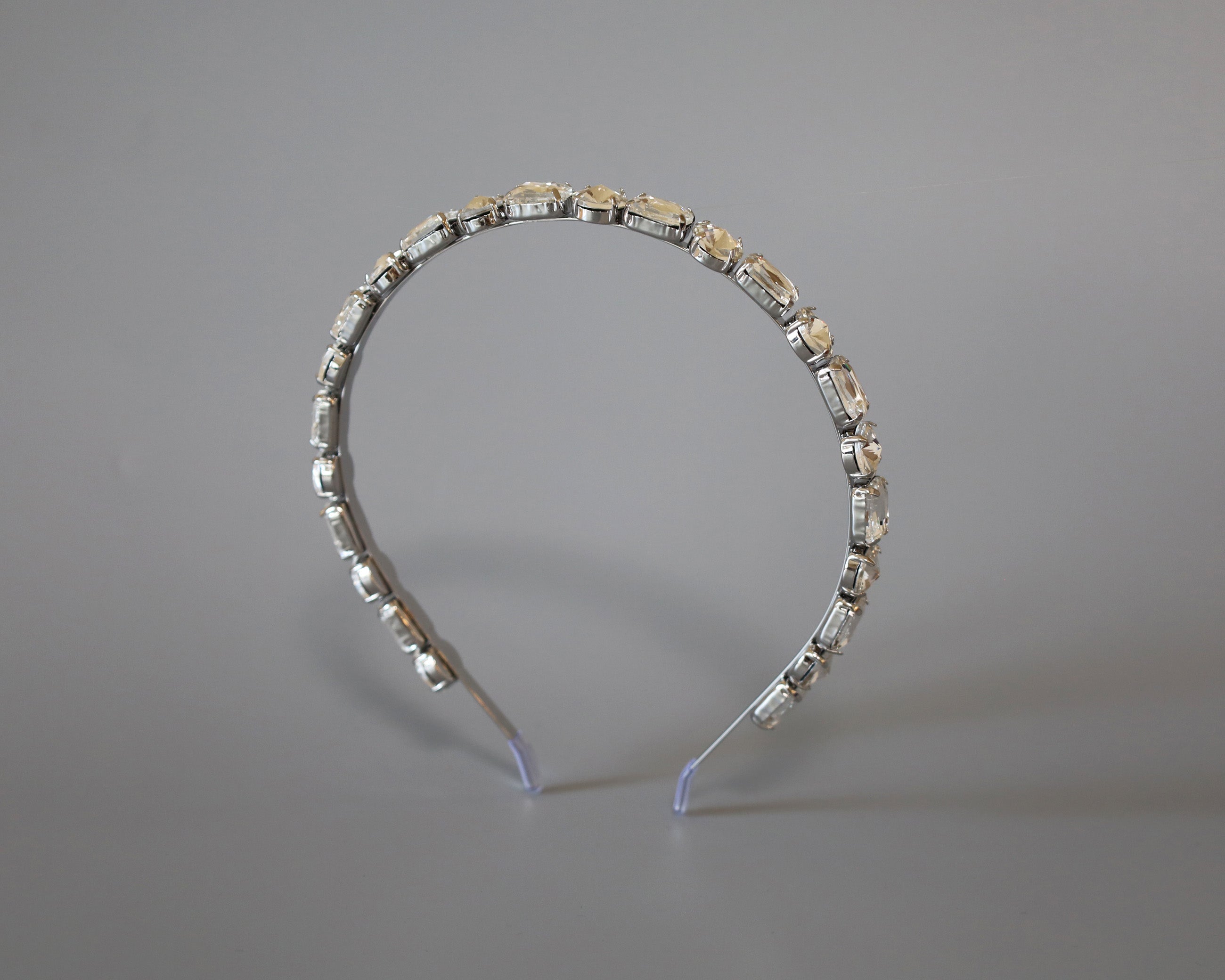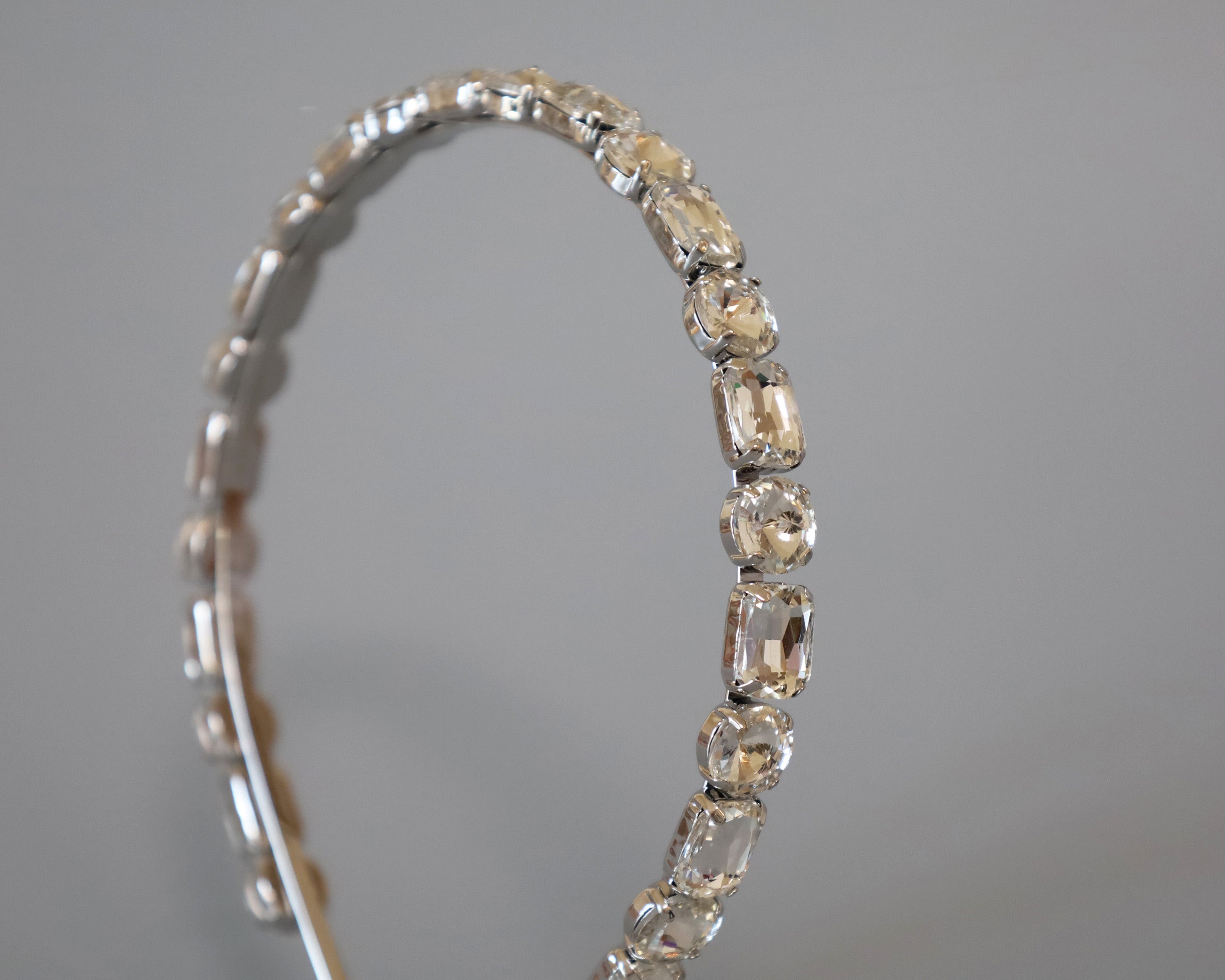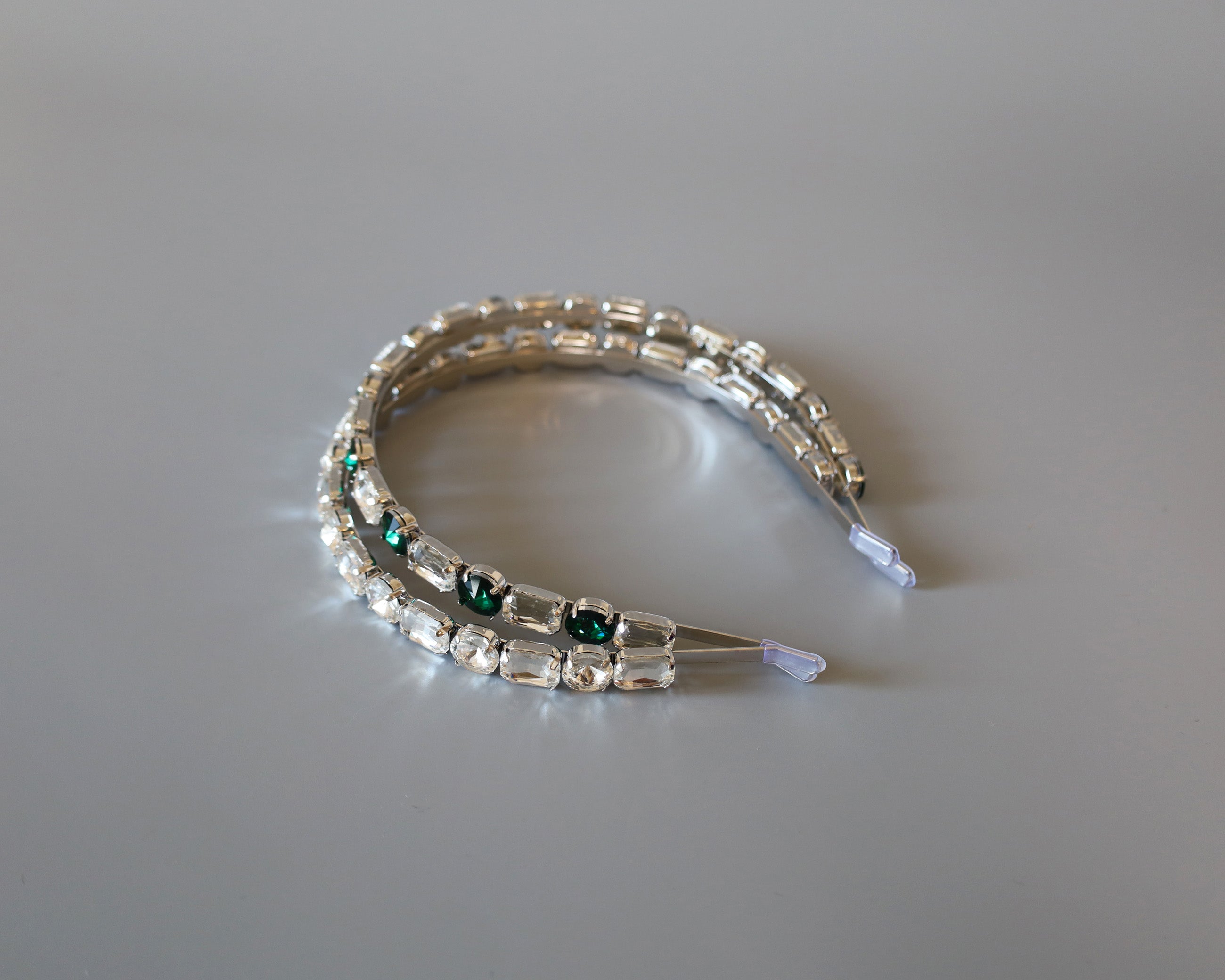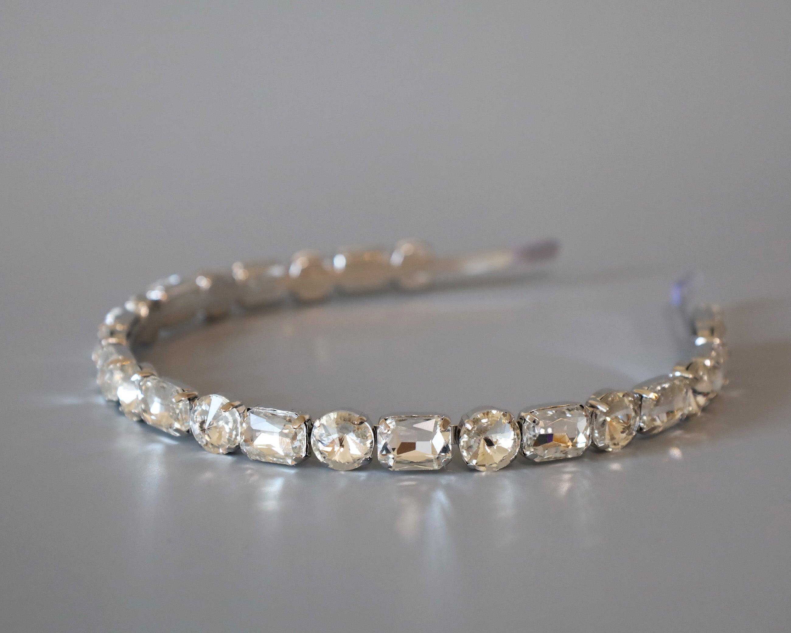 シルバーのメタルフレームに大粒クリアビジューをたっぷり並べた乙女心くすぐるキラキラカチューシャ。