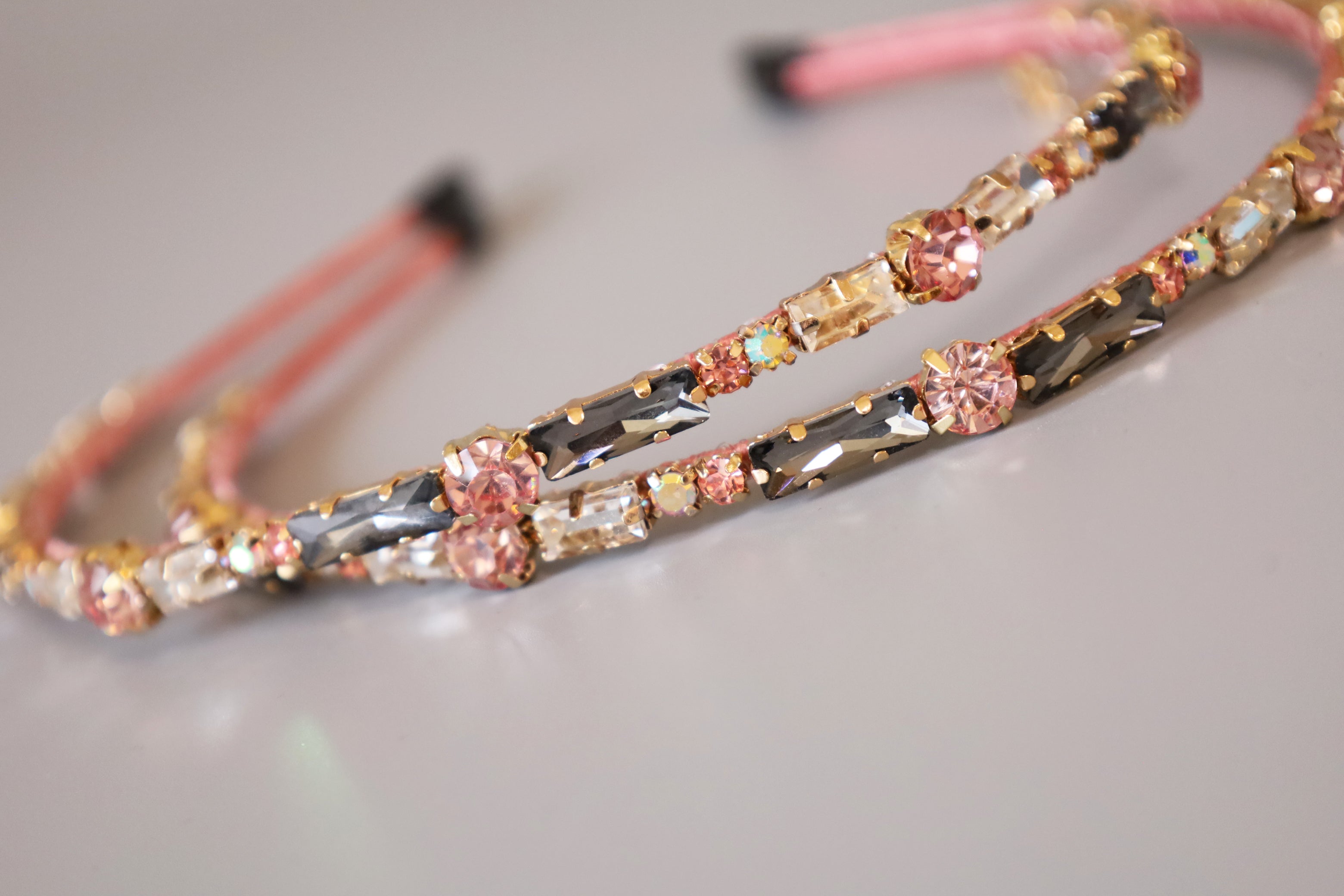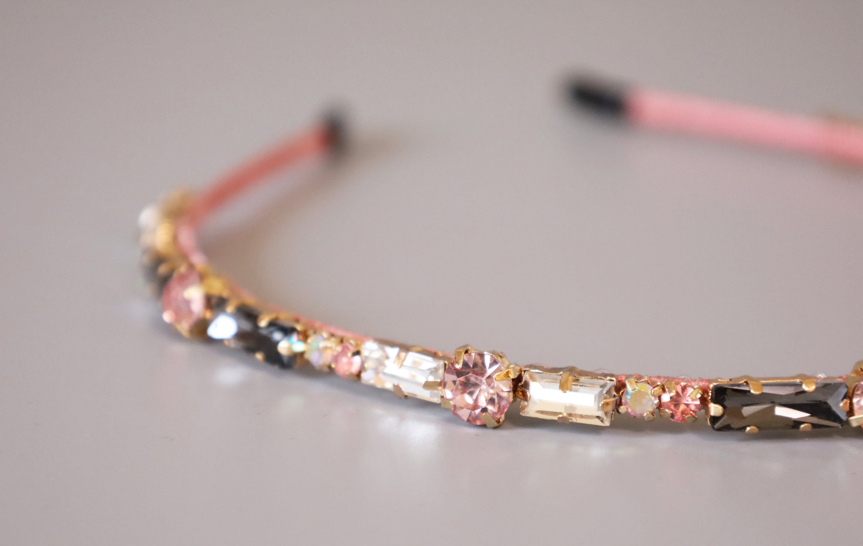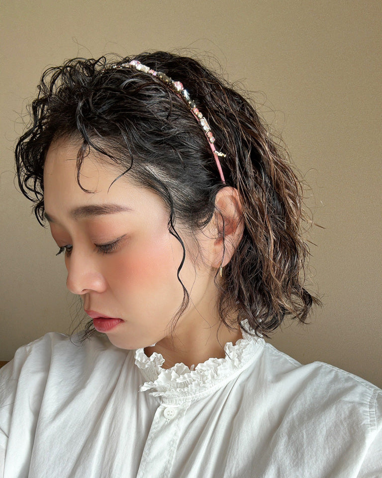 フェミニンなピンクのボディにキラキラビジューをたっぷり乗せたカチューシャ。