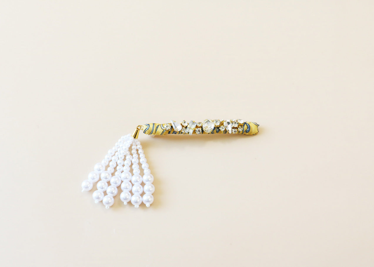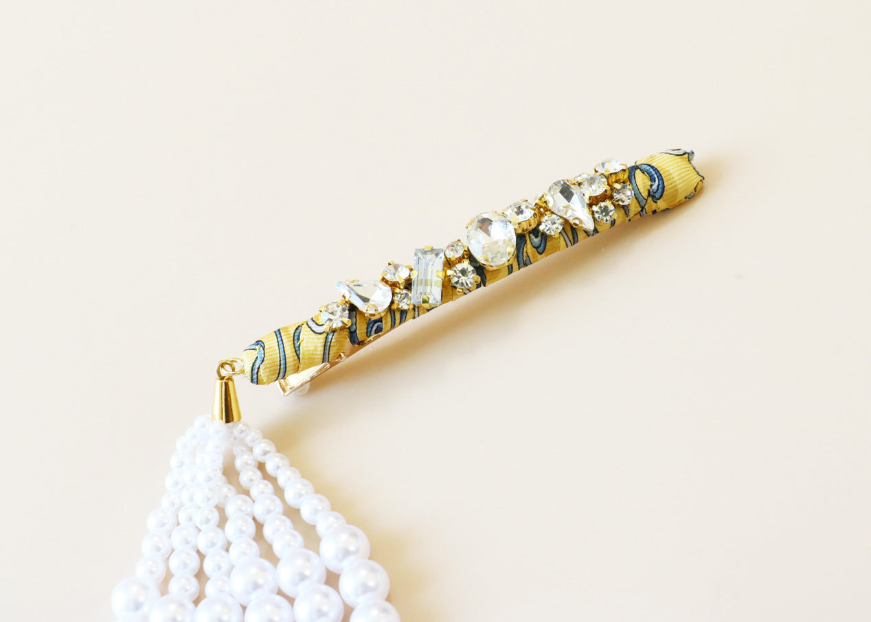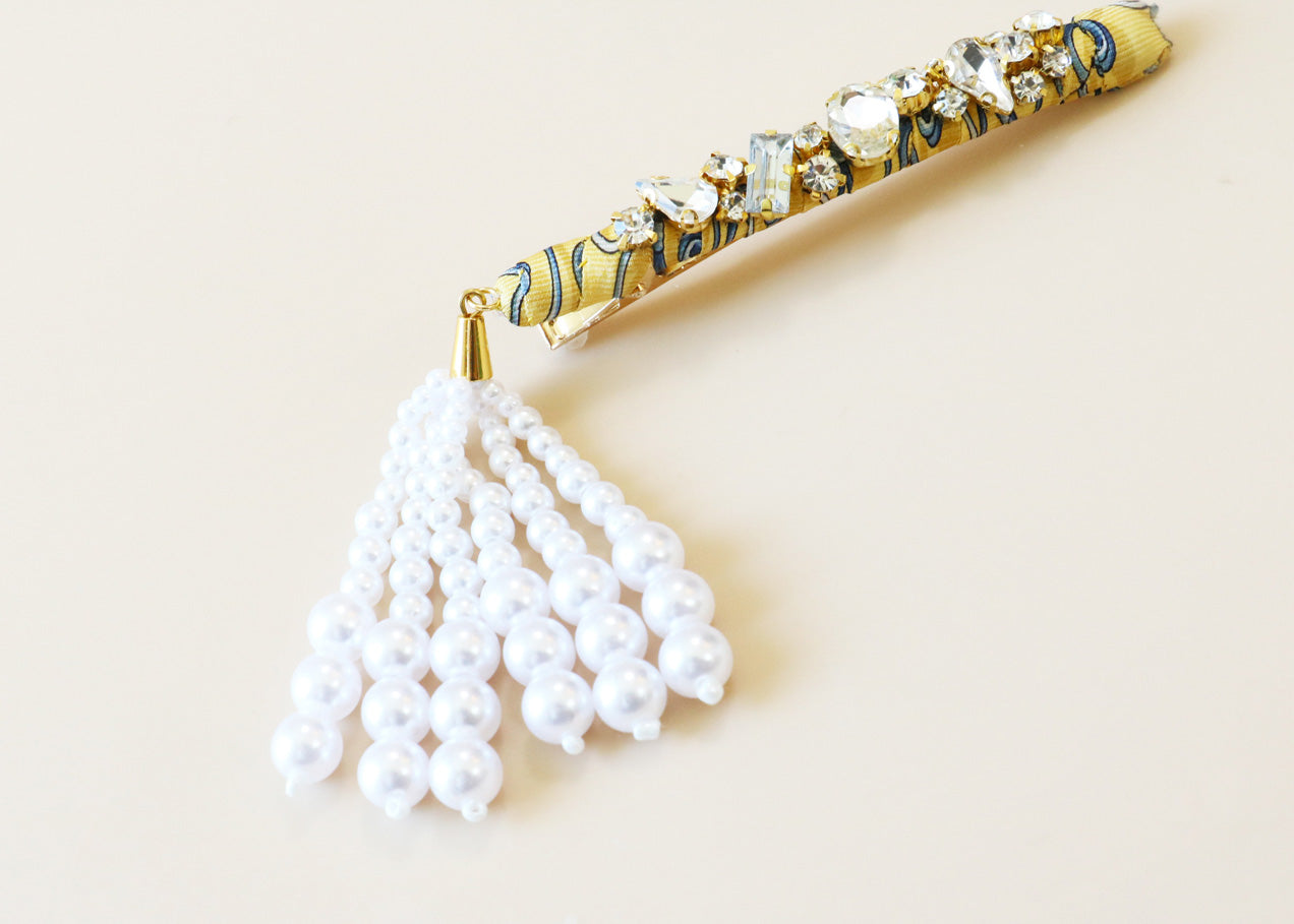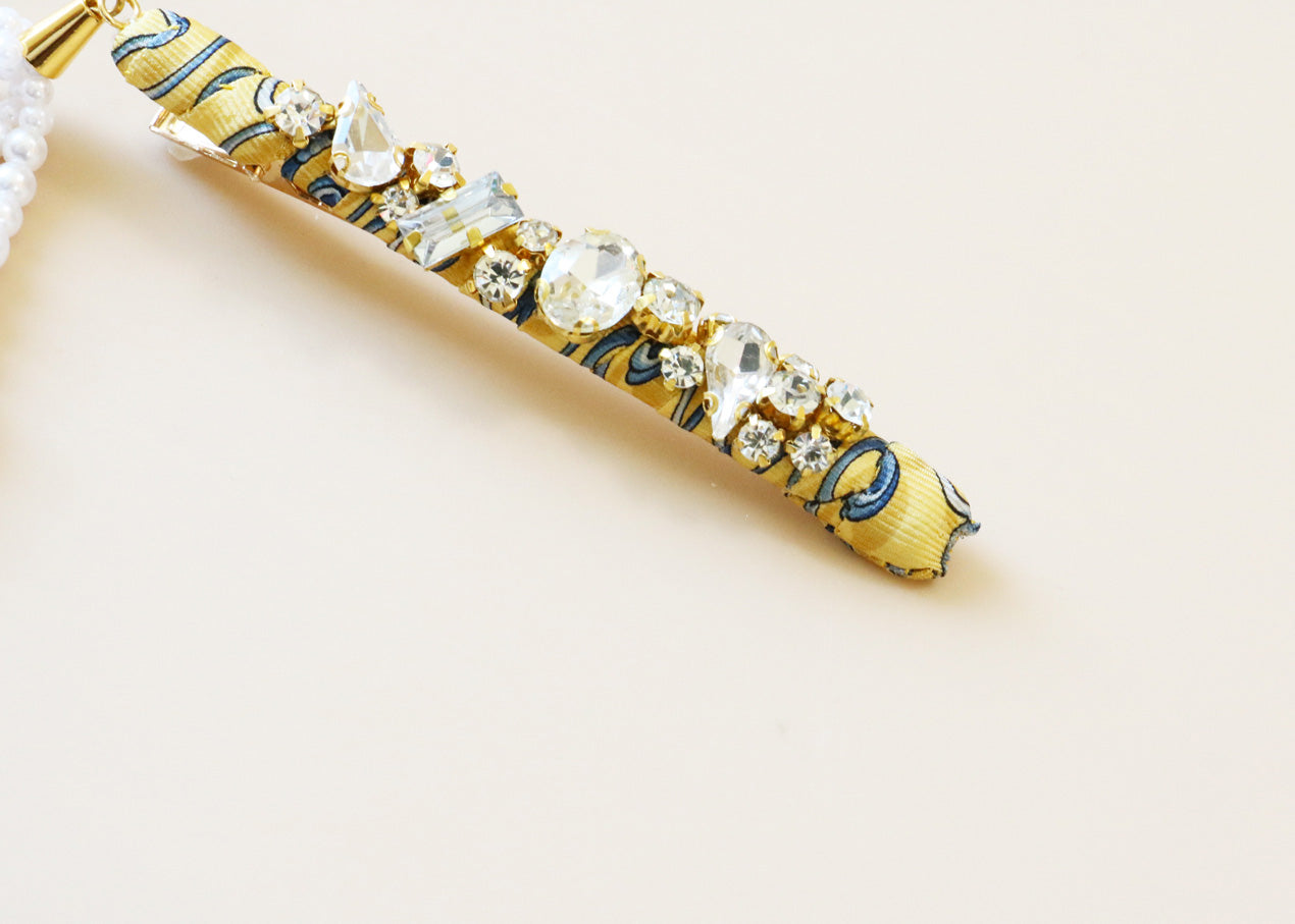 パールやクリアビジューのきらめきを引き立てる上品なイエローカラーが魅力的。