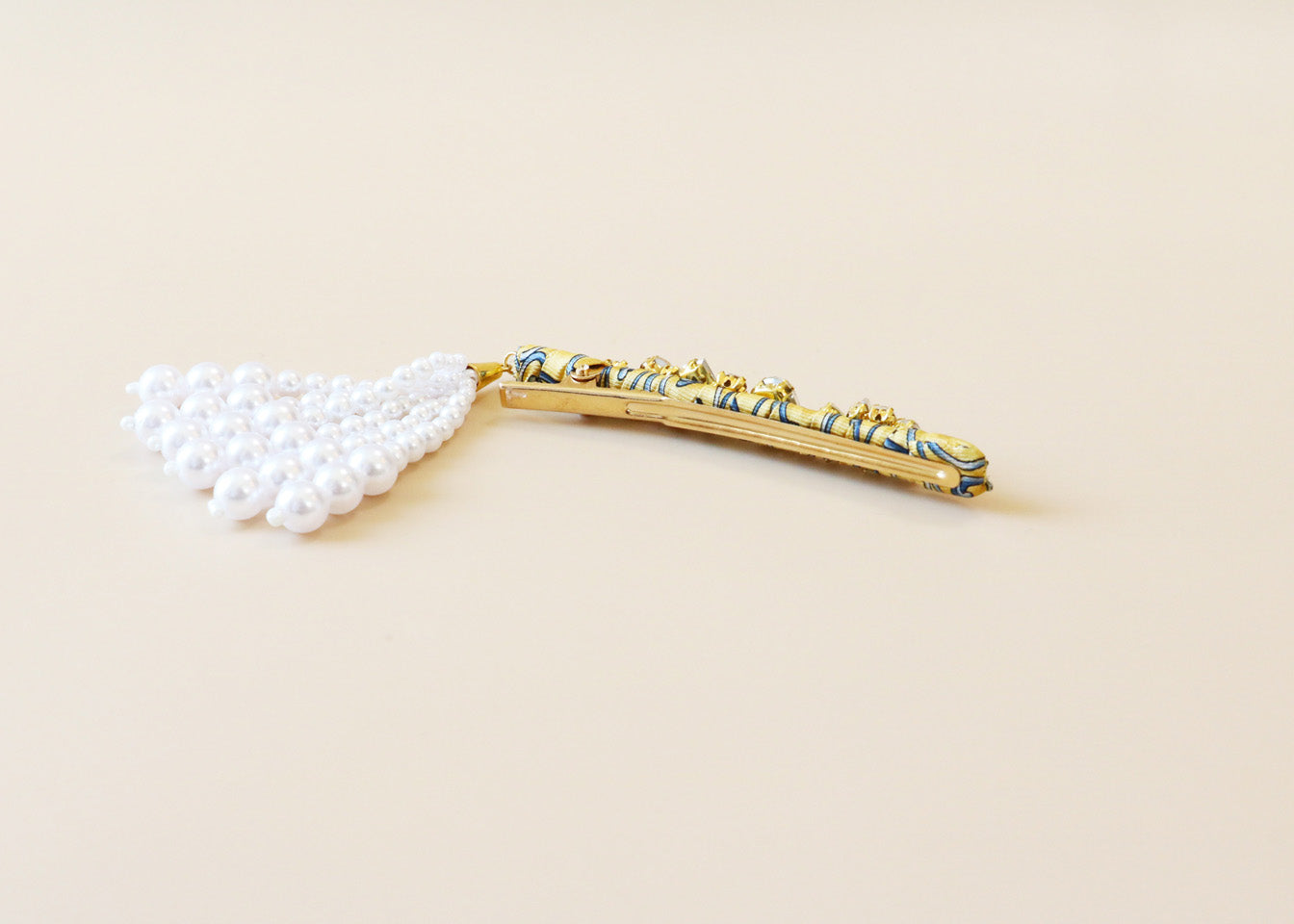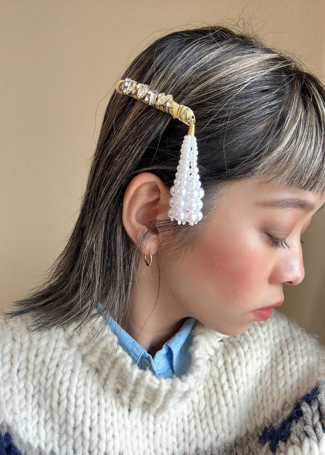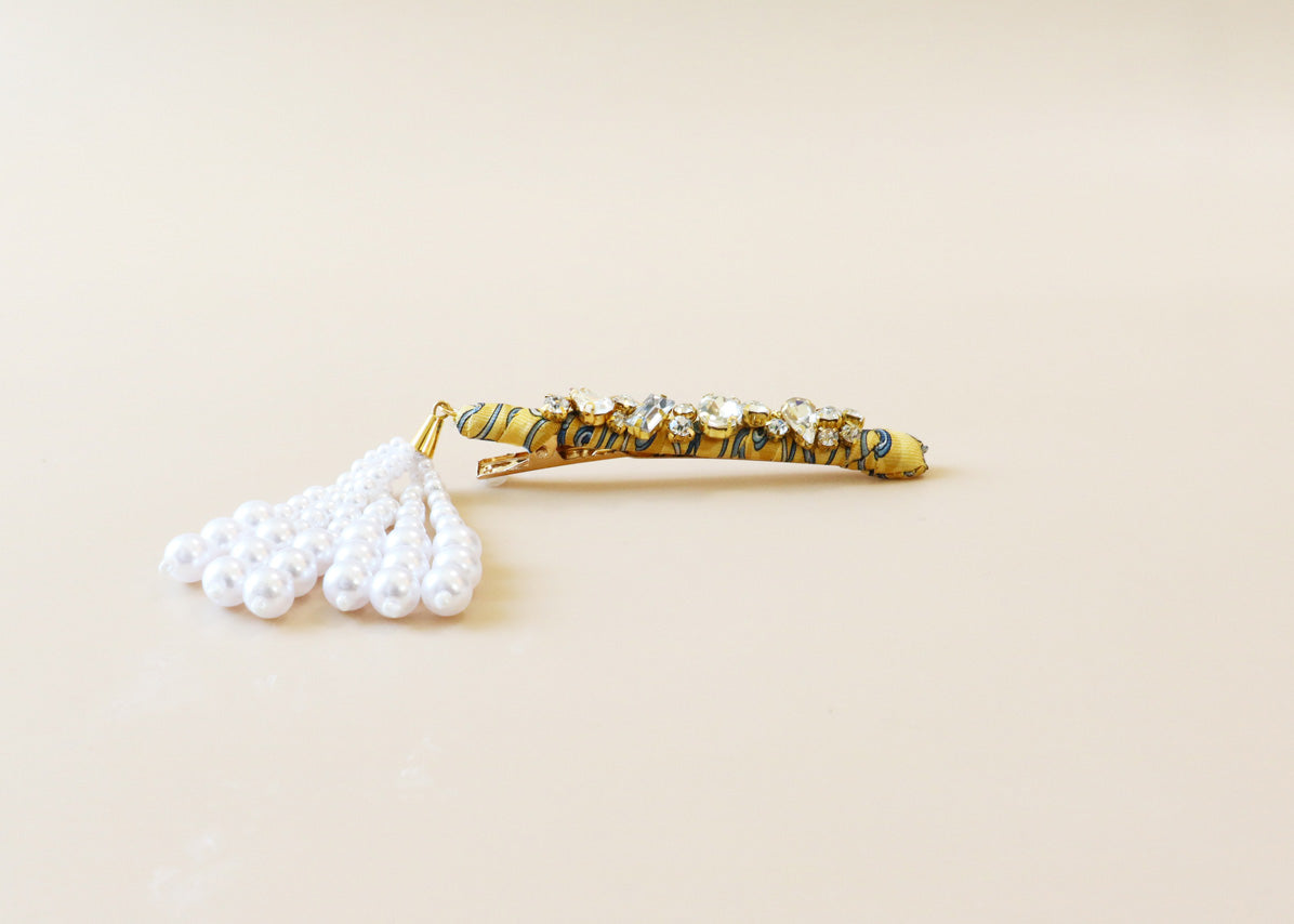 やわらかなイエローカラーのヘアクリップに、揺れるパールの装飾がエレガント。