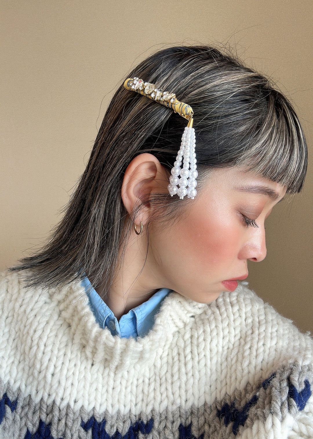 ゆらゆら揺れるパールがシンプルなヘアスタイリングを簡単に高見えを叶えます。