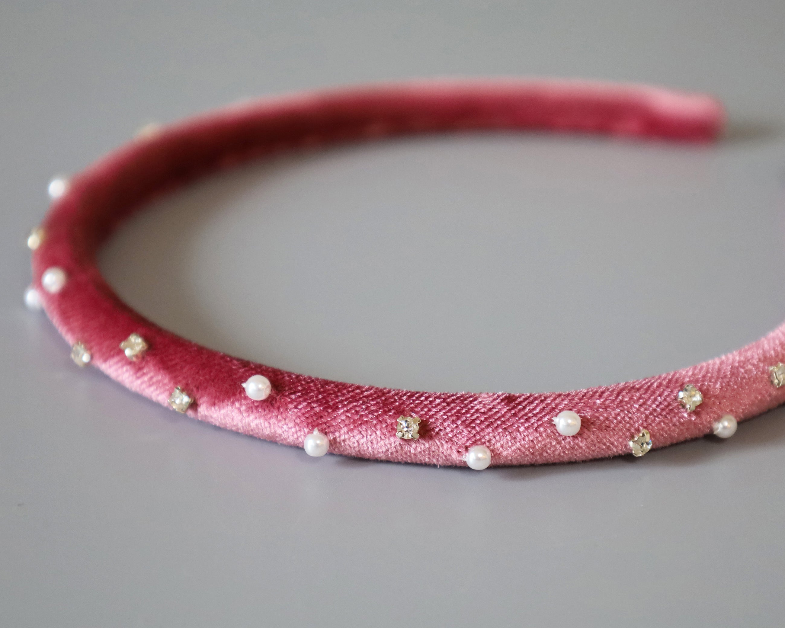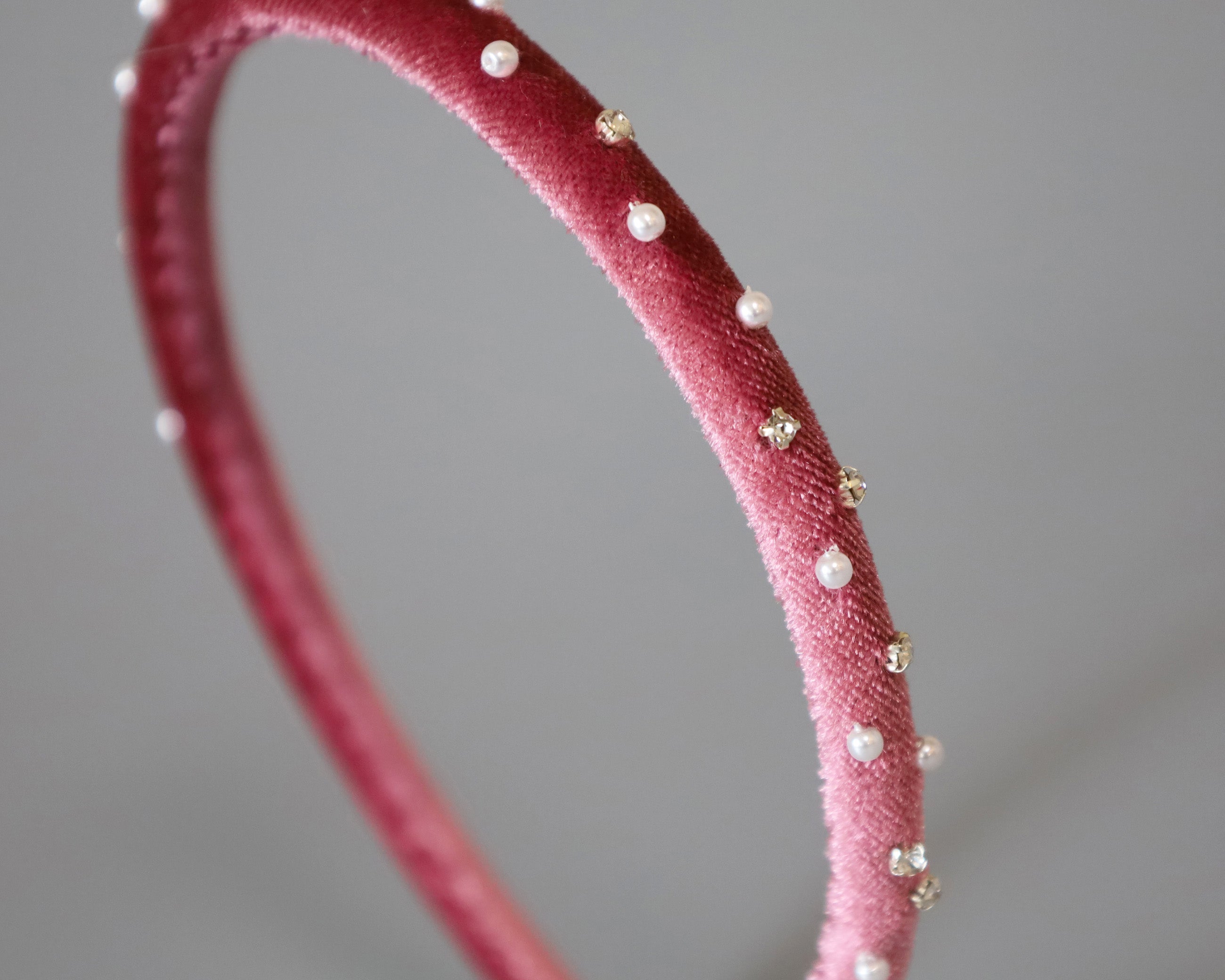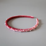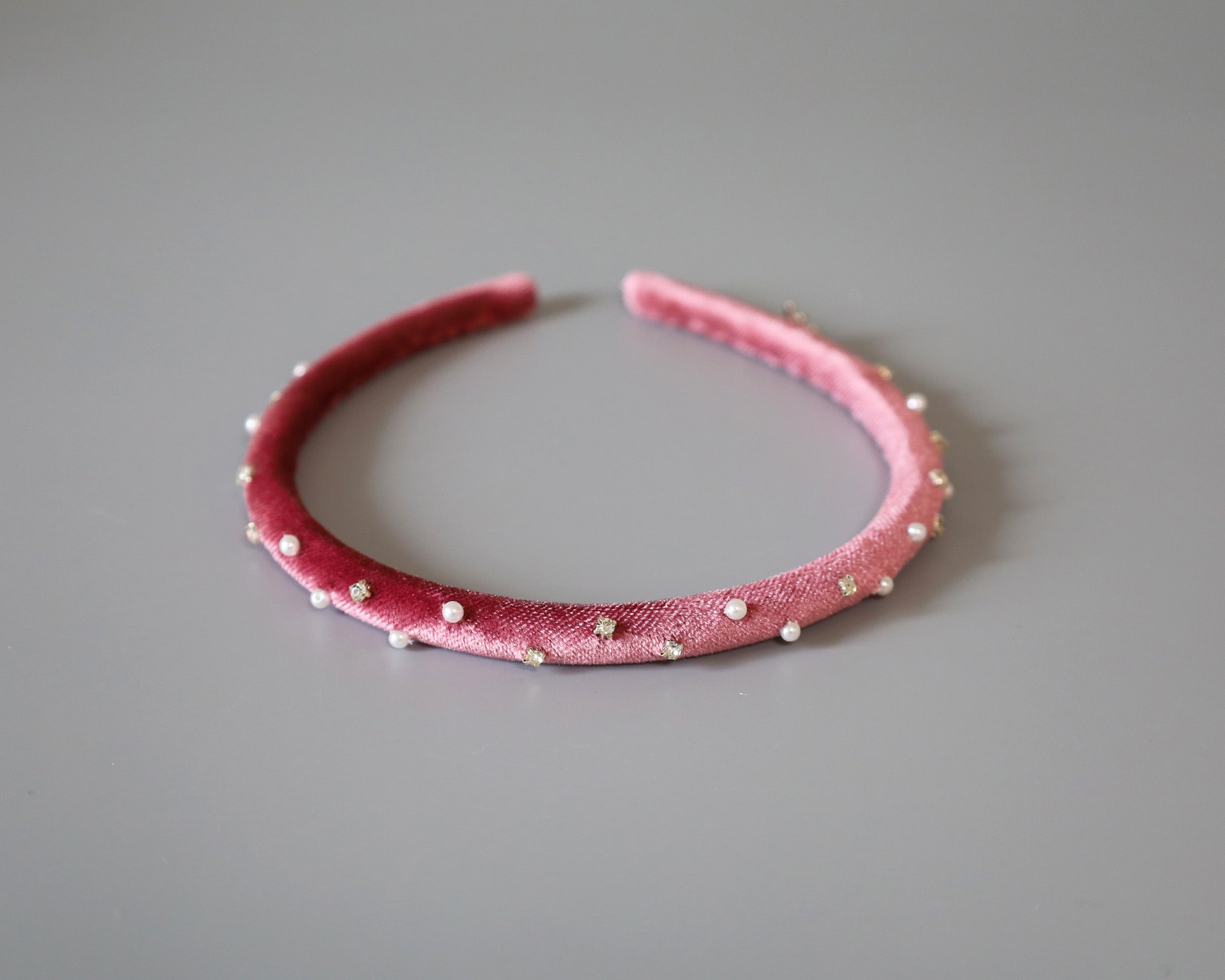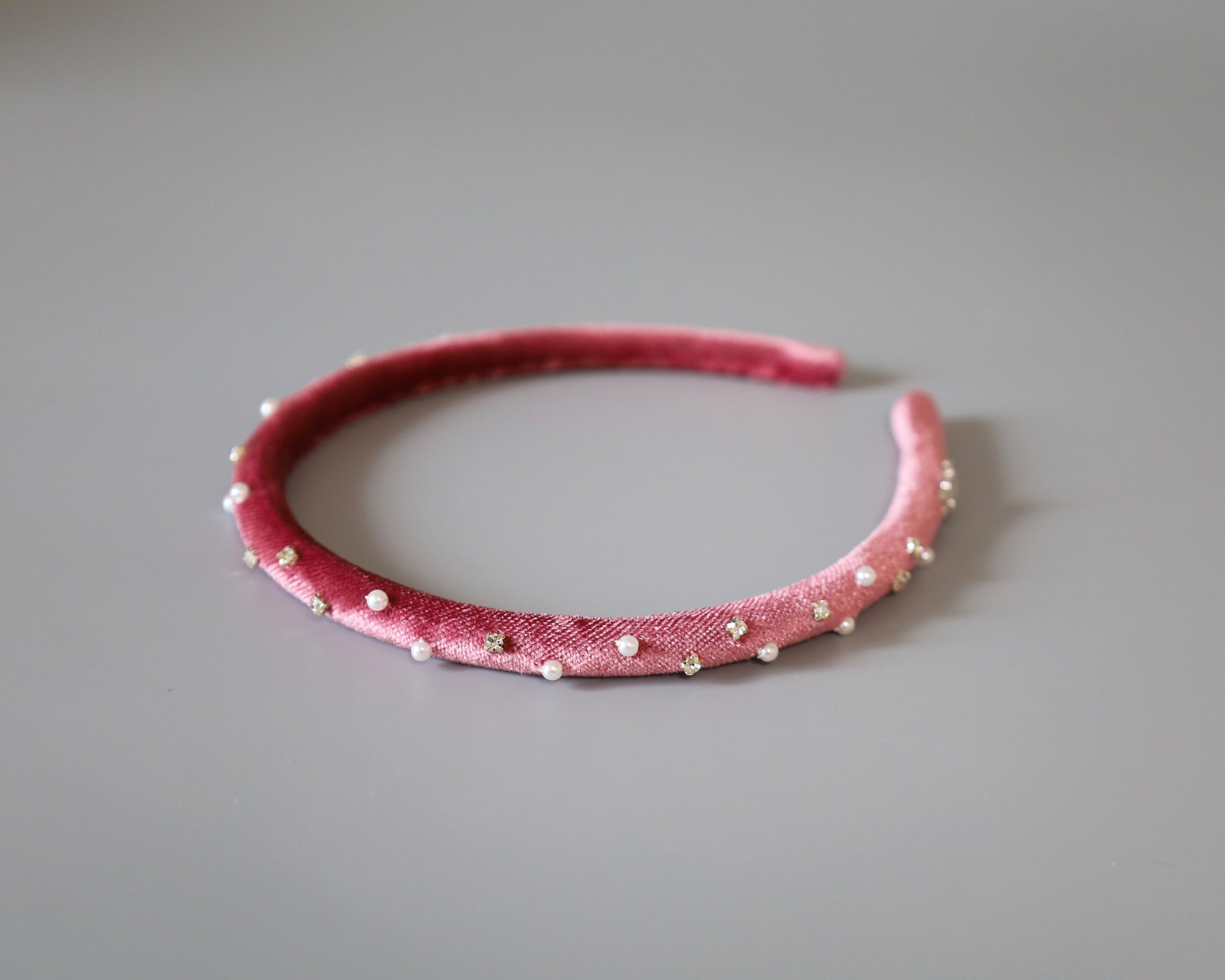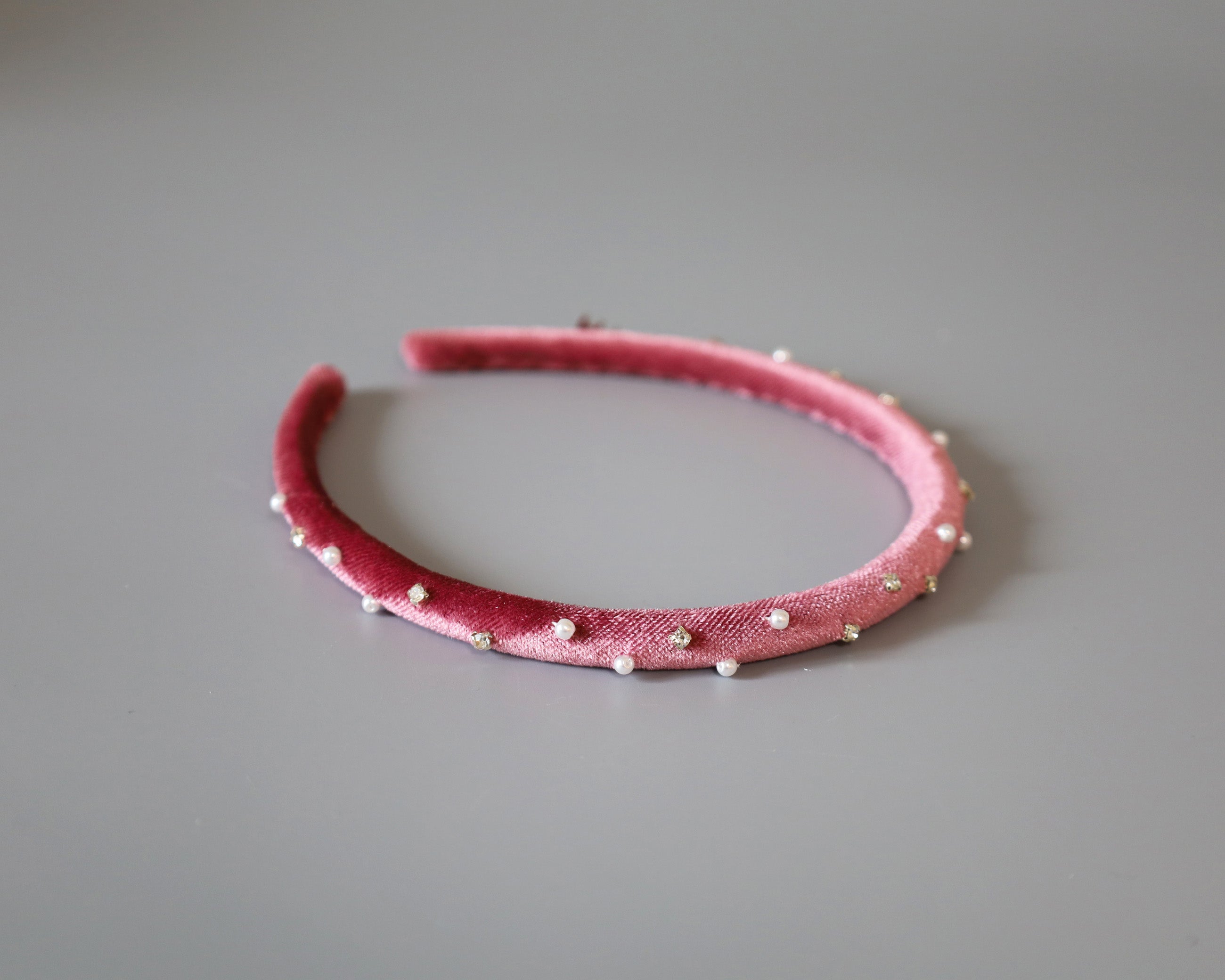 大人っぽさのあるピンクのベロアに小粒のパールとクリアビジューを散らしたカチューシャ。