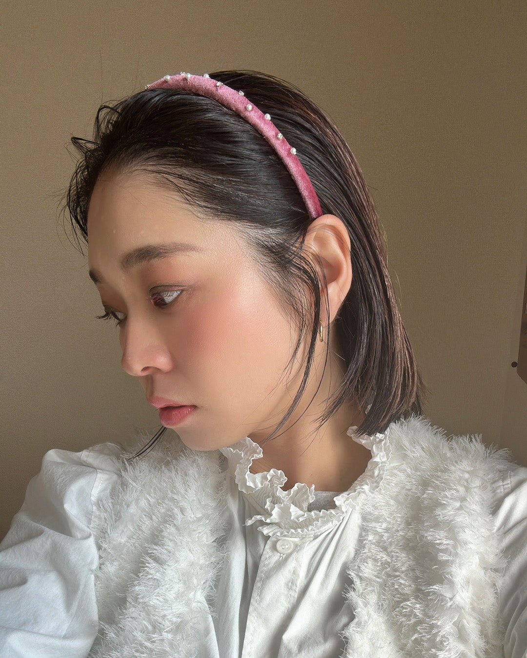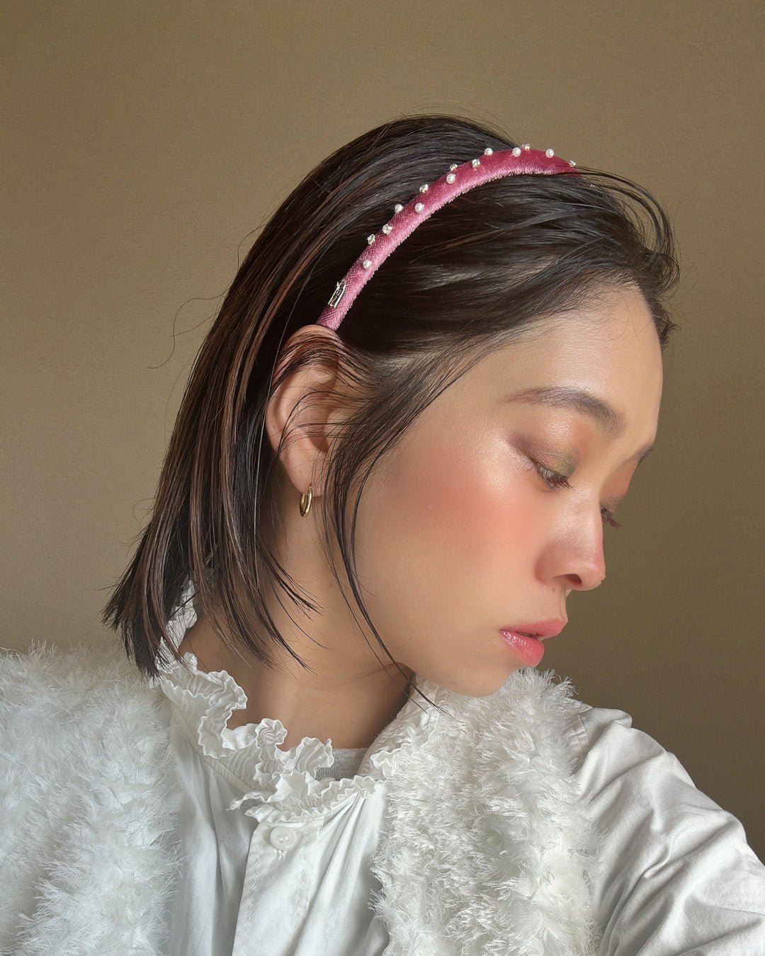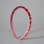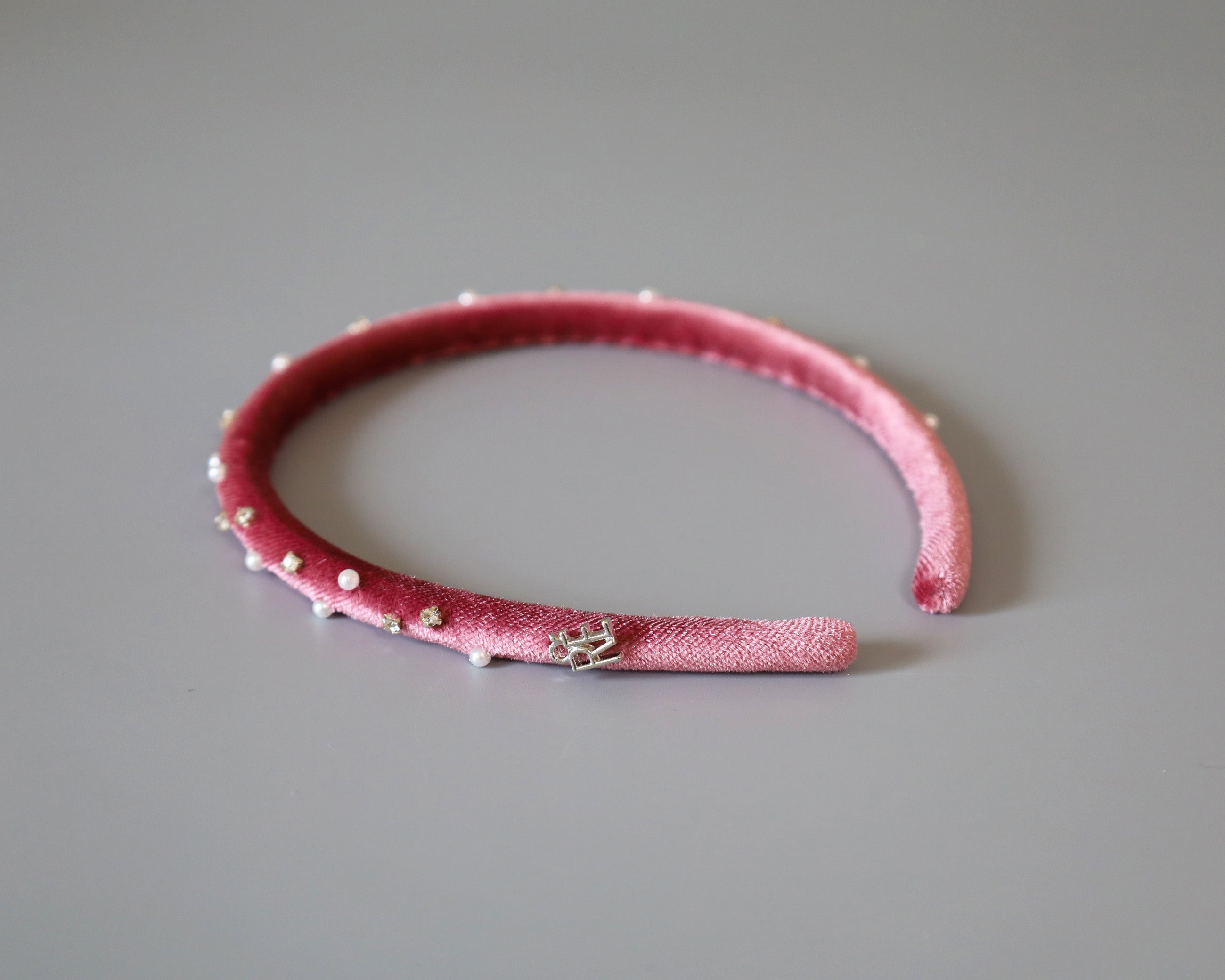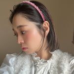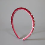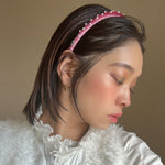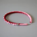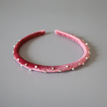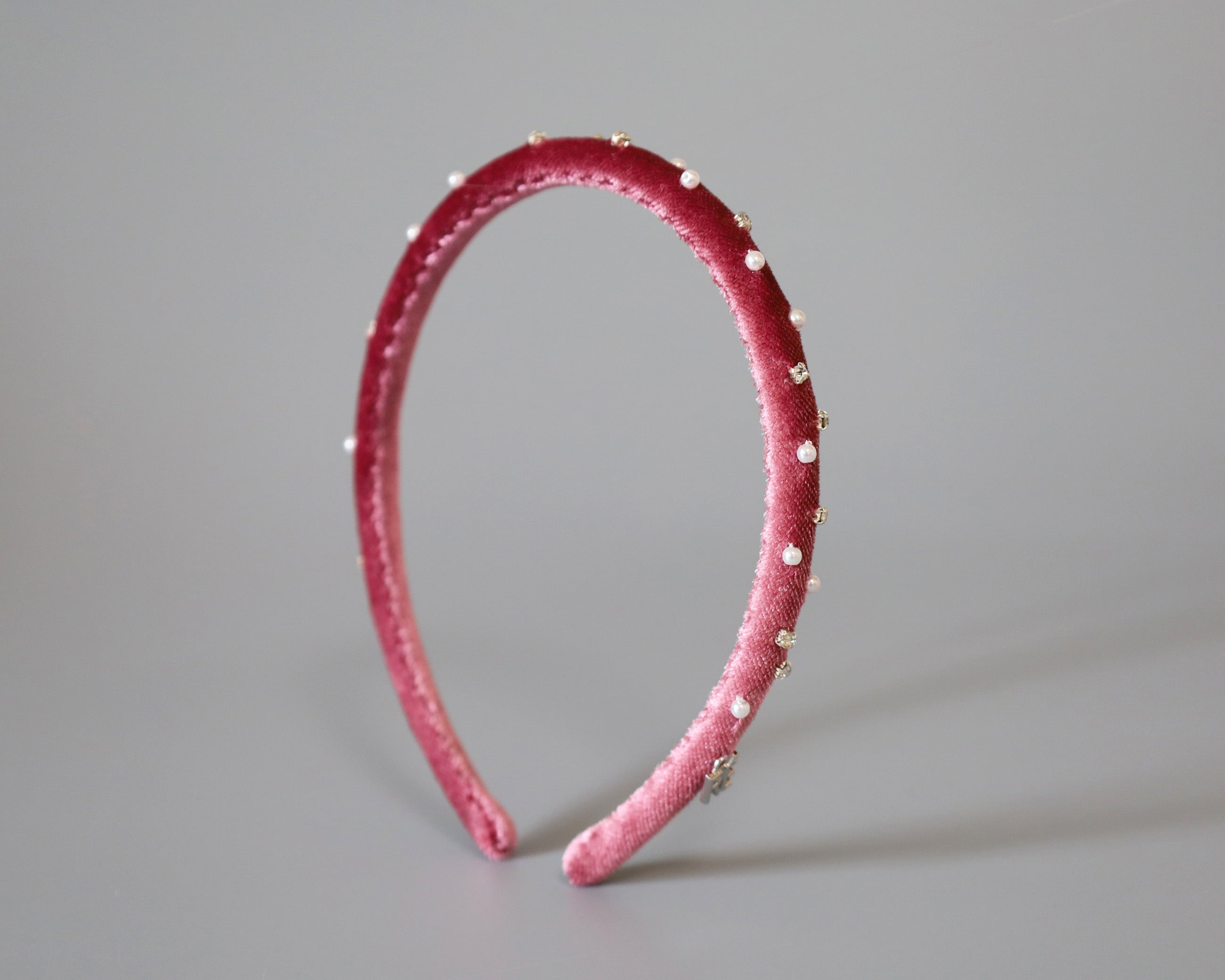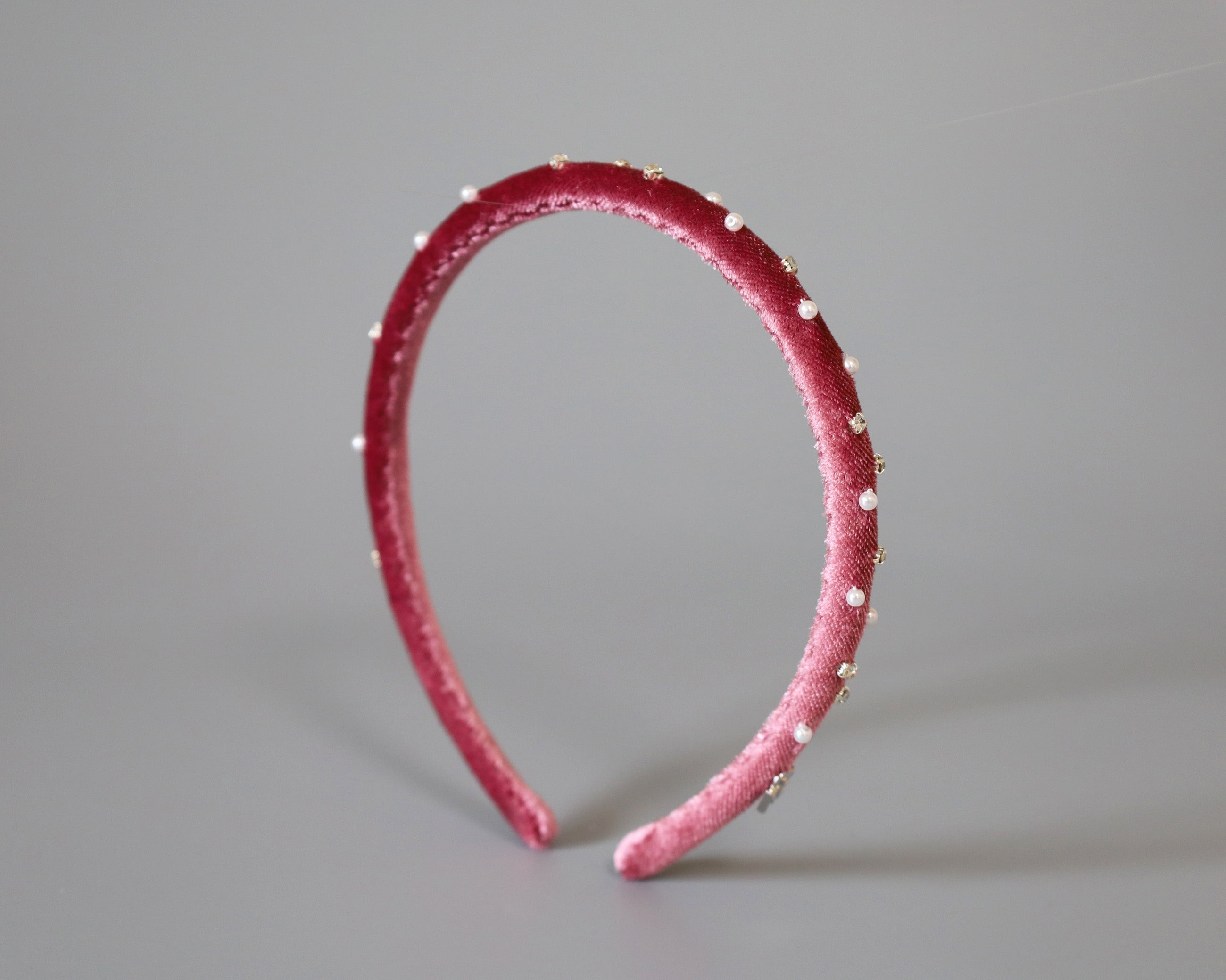 大人っぽさのあるピンクのベロアに小粒のパールとクリアビジューを散らしたカチューシャ。