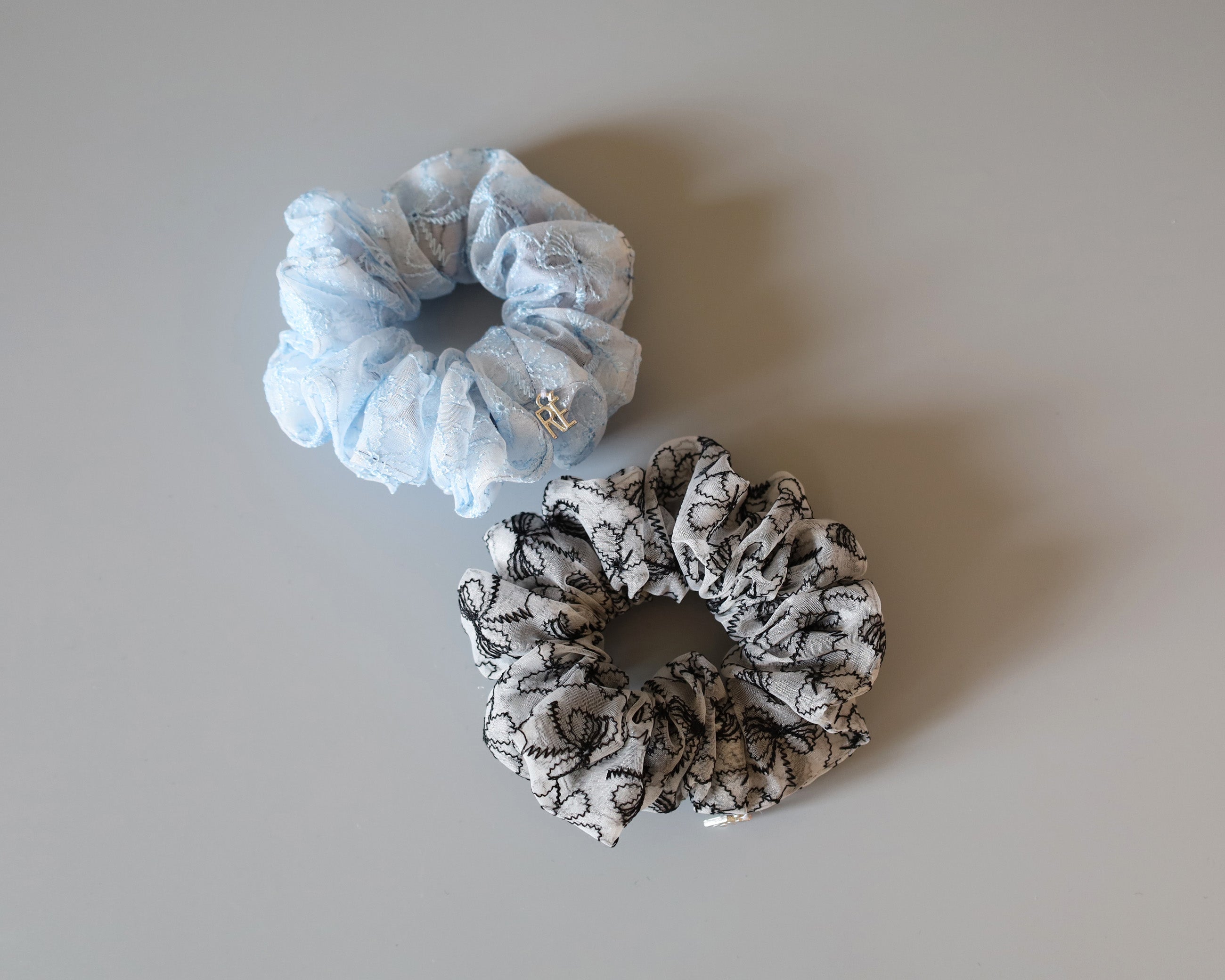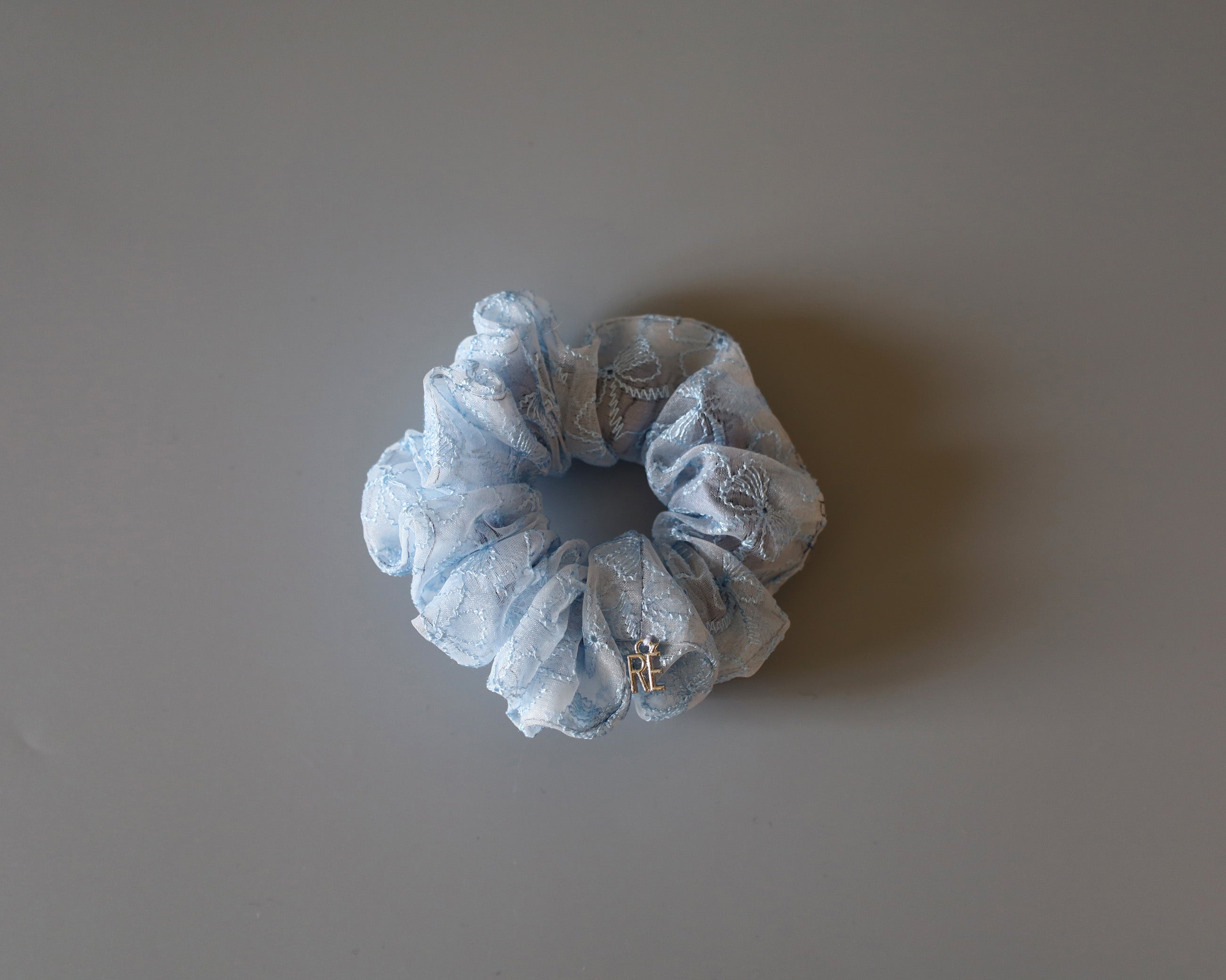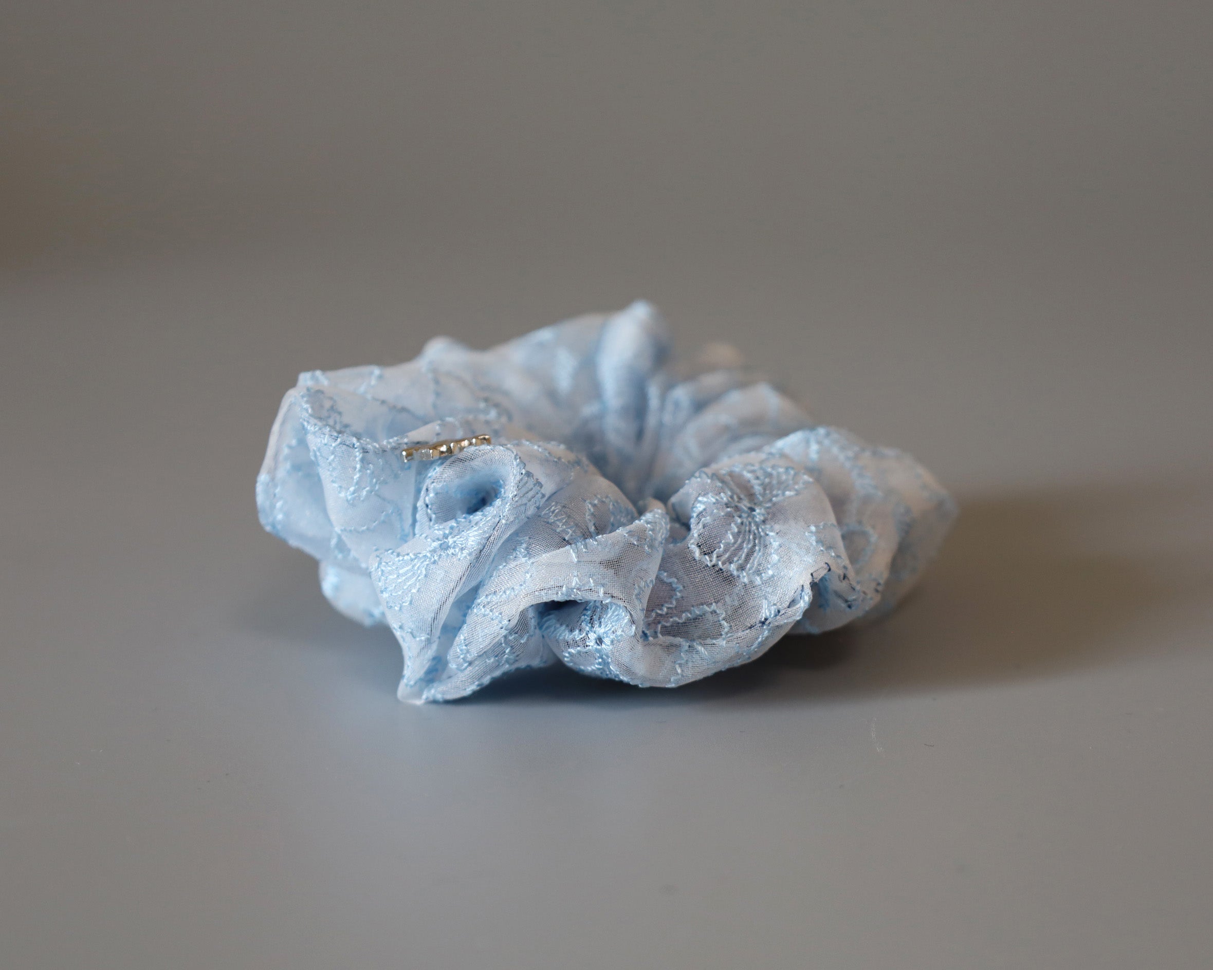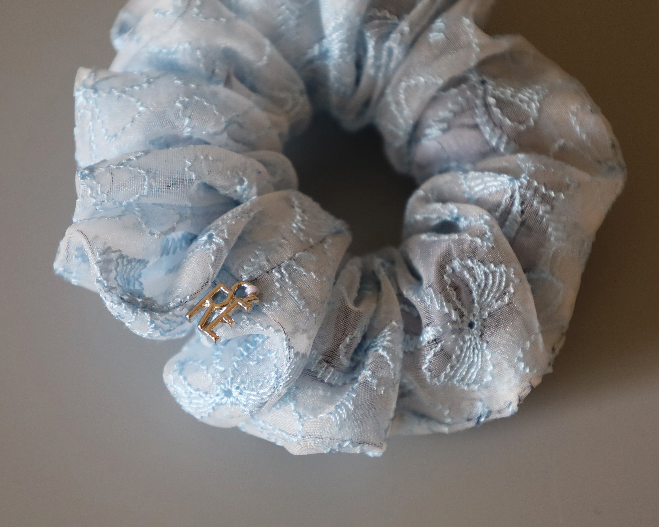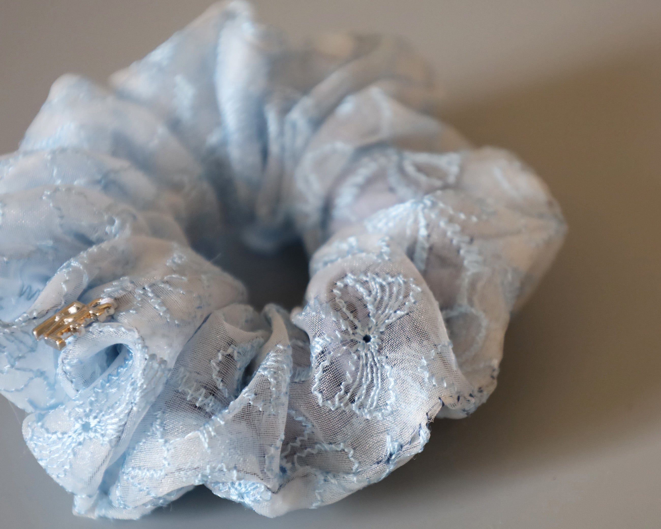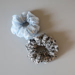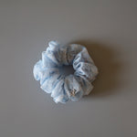 ホワイト×ライトブルーが軽やかなリボン柄シュシュのミニサイズ。