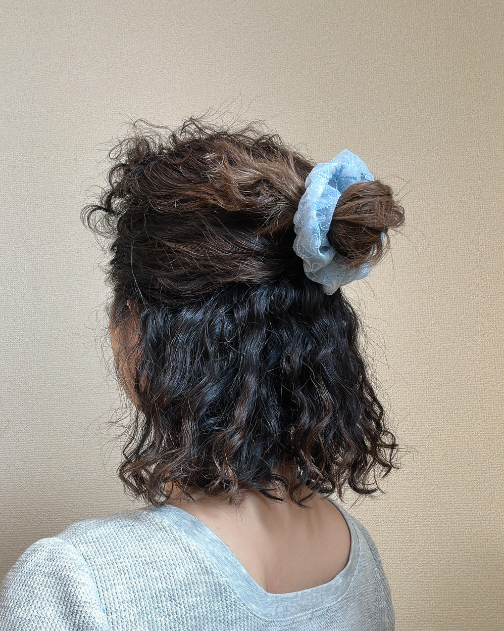 ミニシュシュでハーフアップを作った後、大きめサイズのシュシュと組み合わせて変形ポニーを作るのも華やかでおすすめ。