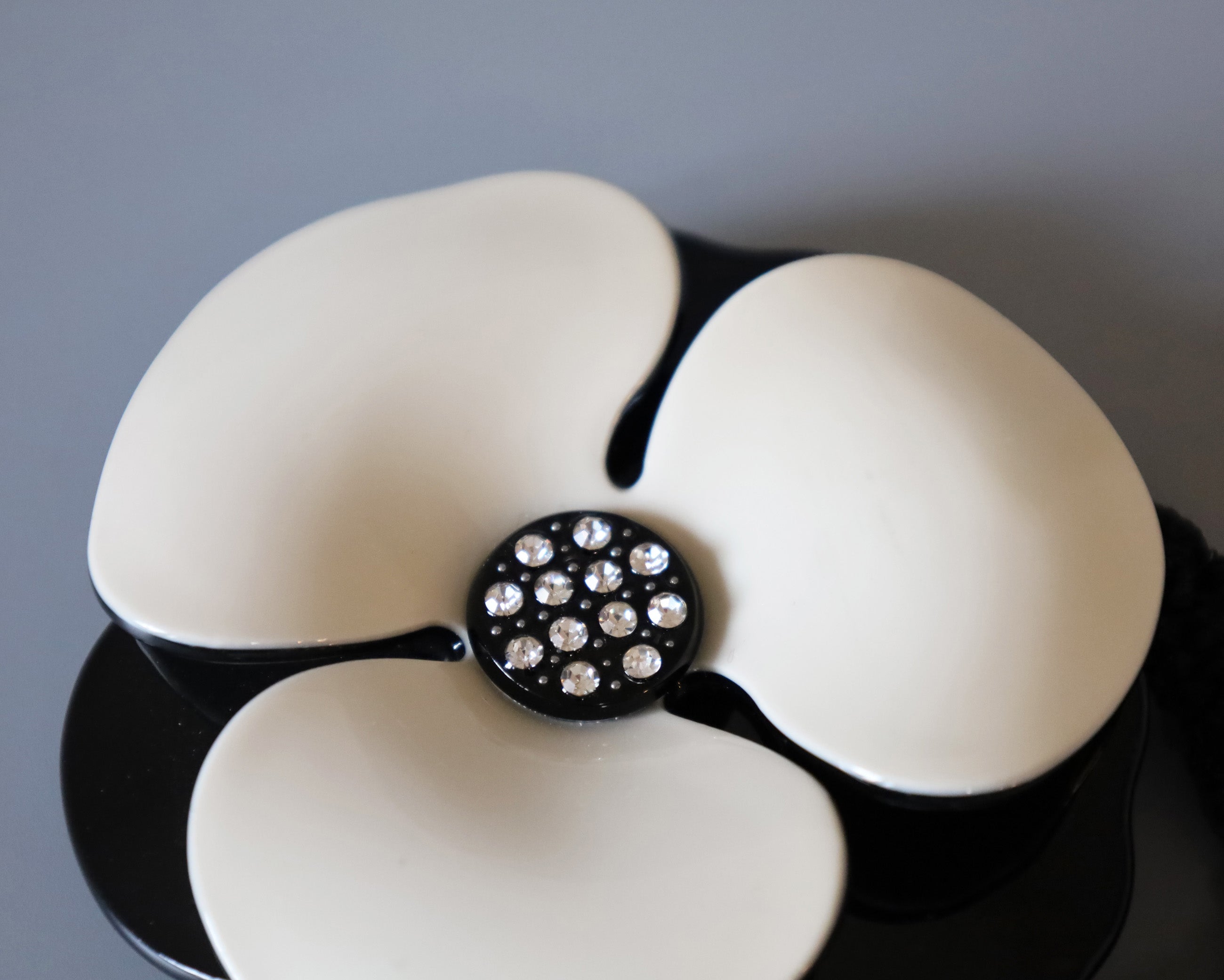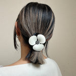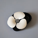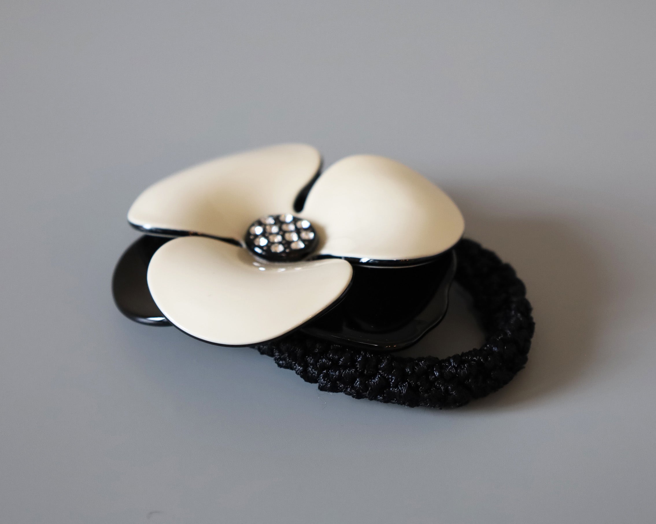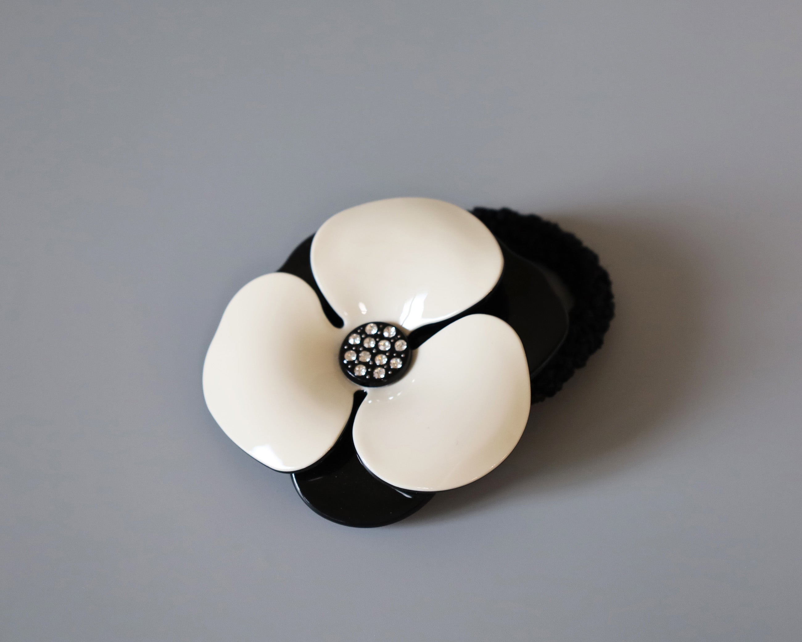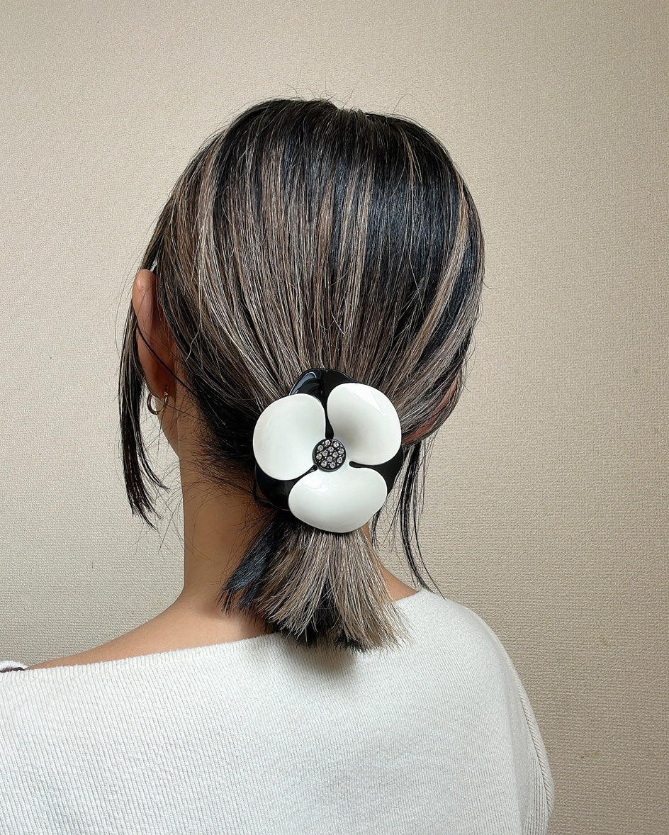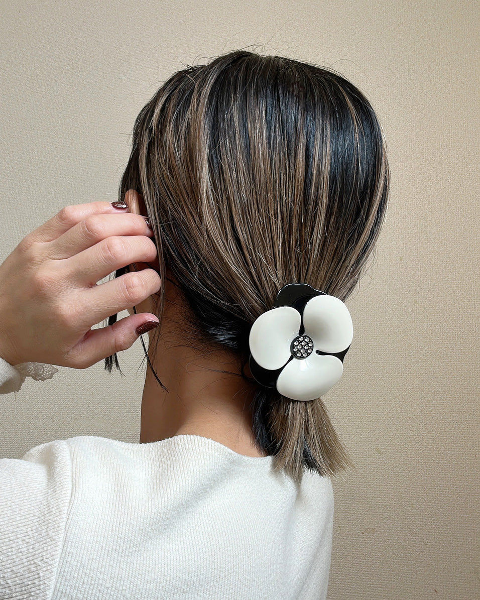 モノトーンのカメリアがレトロシックなヘアポニー。