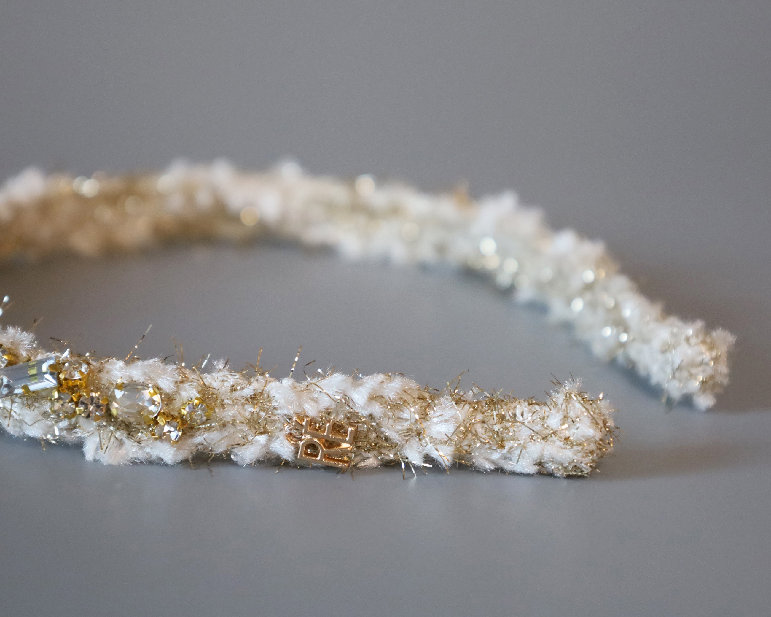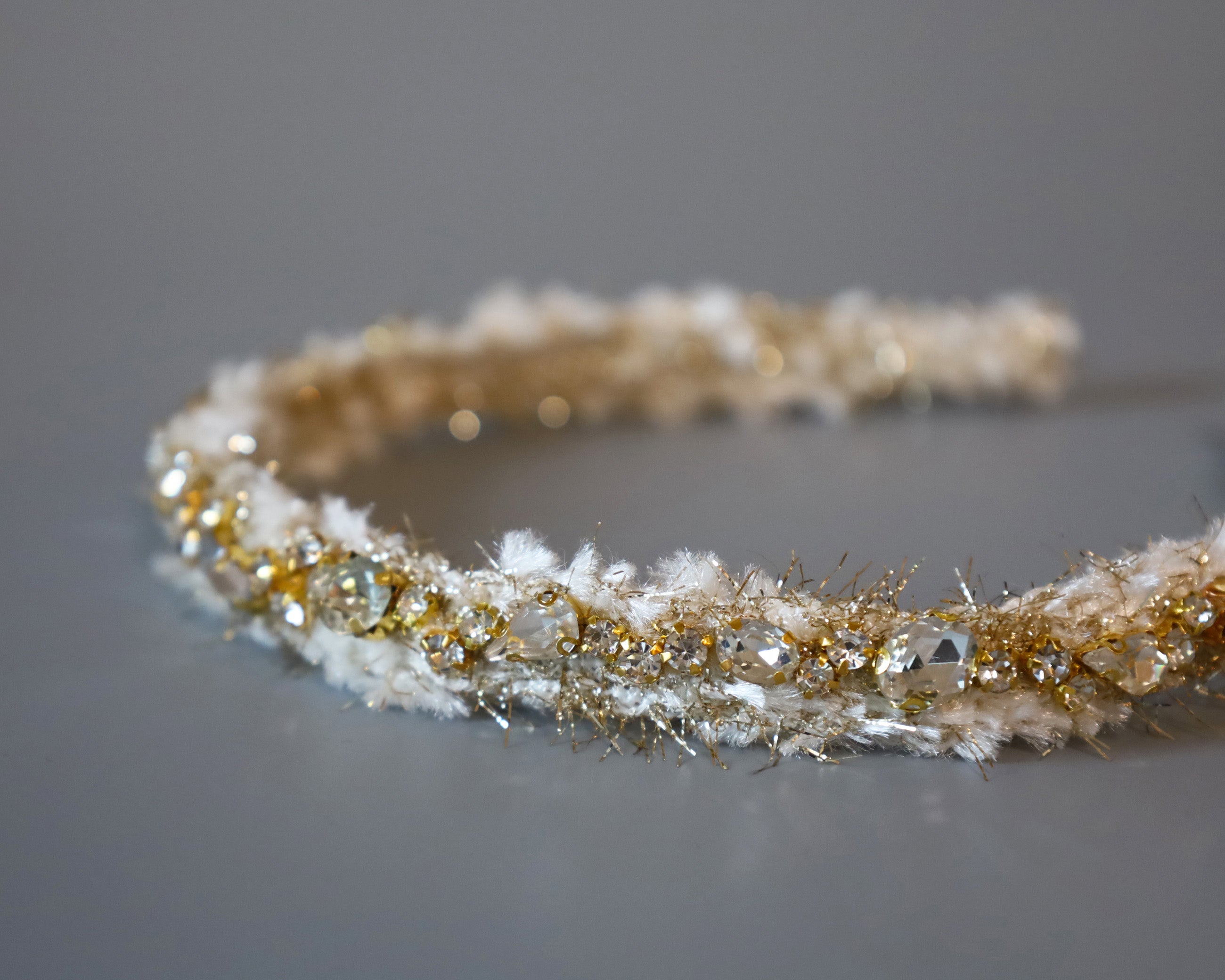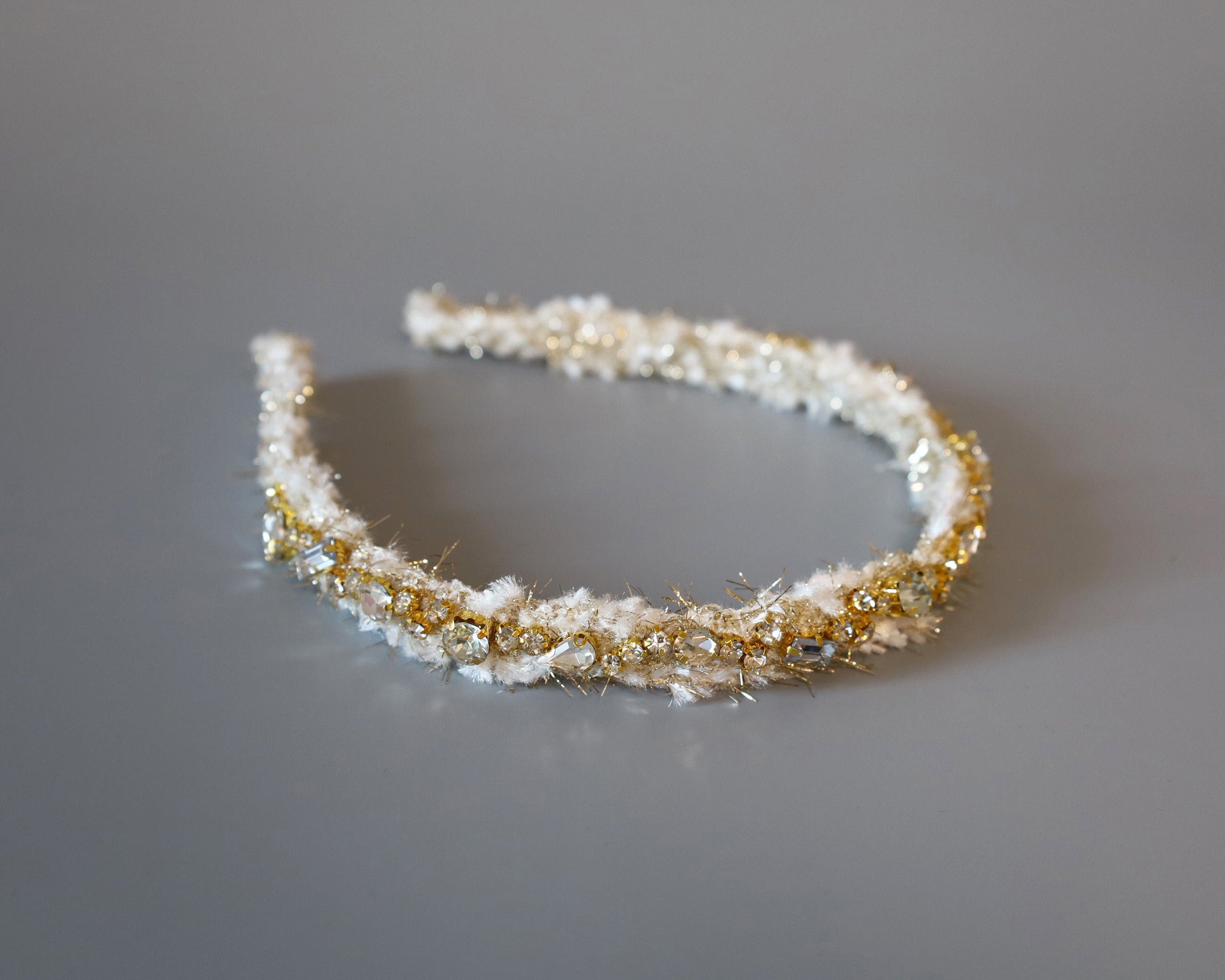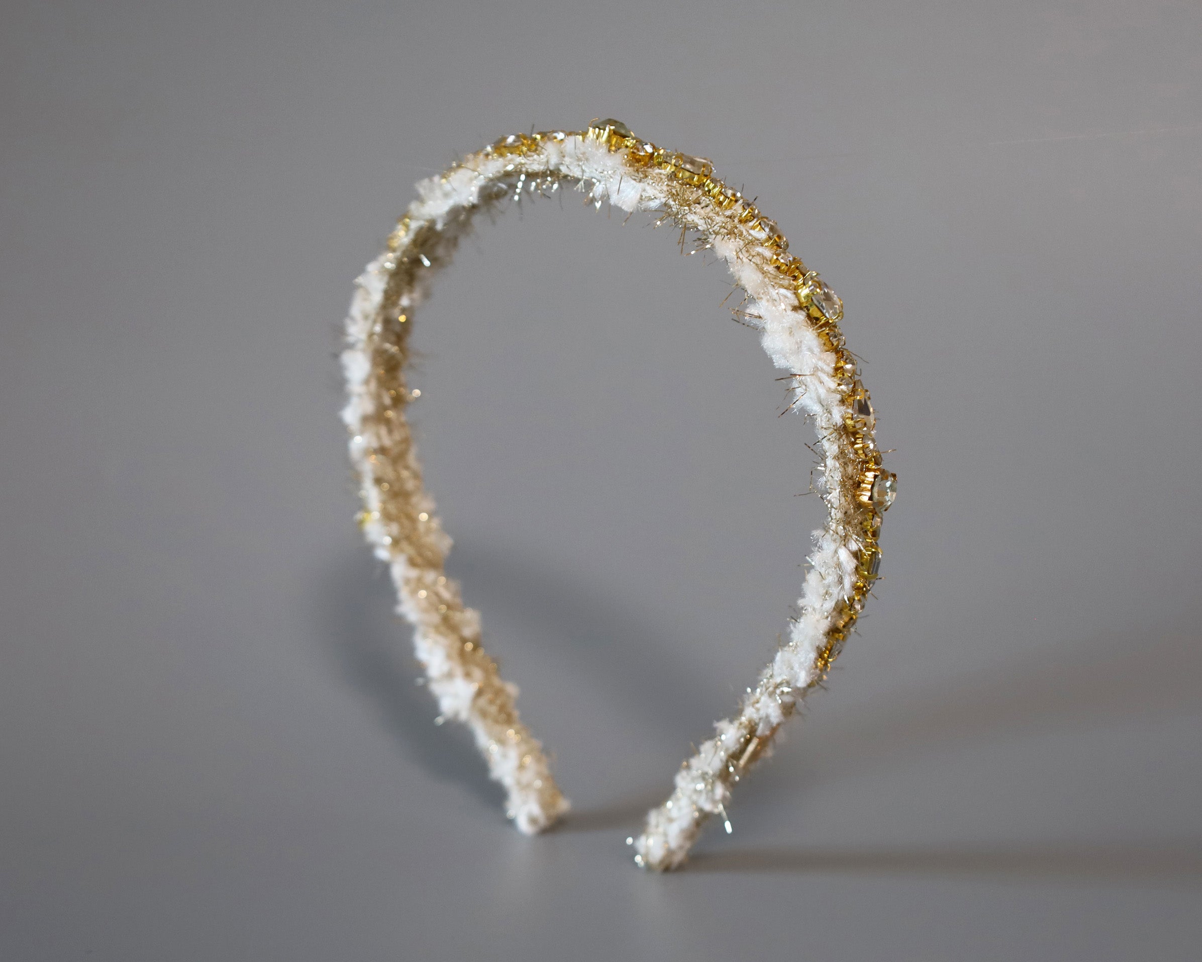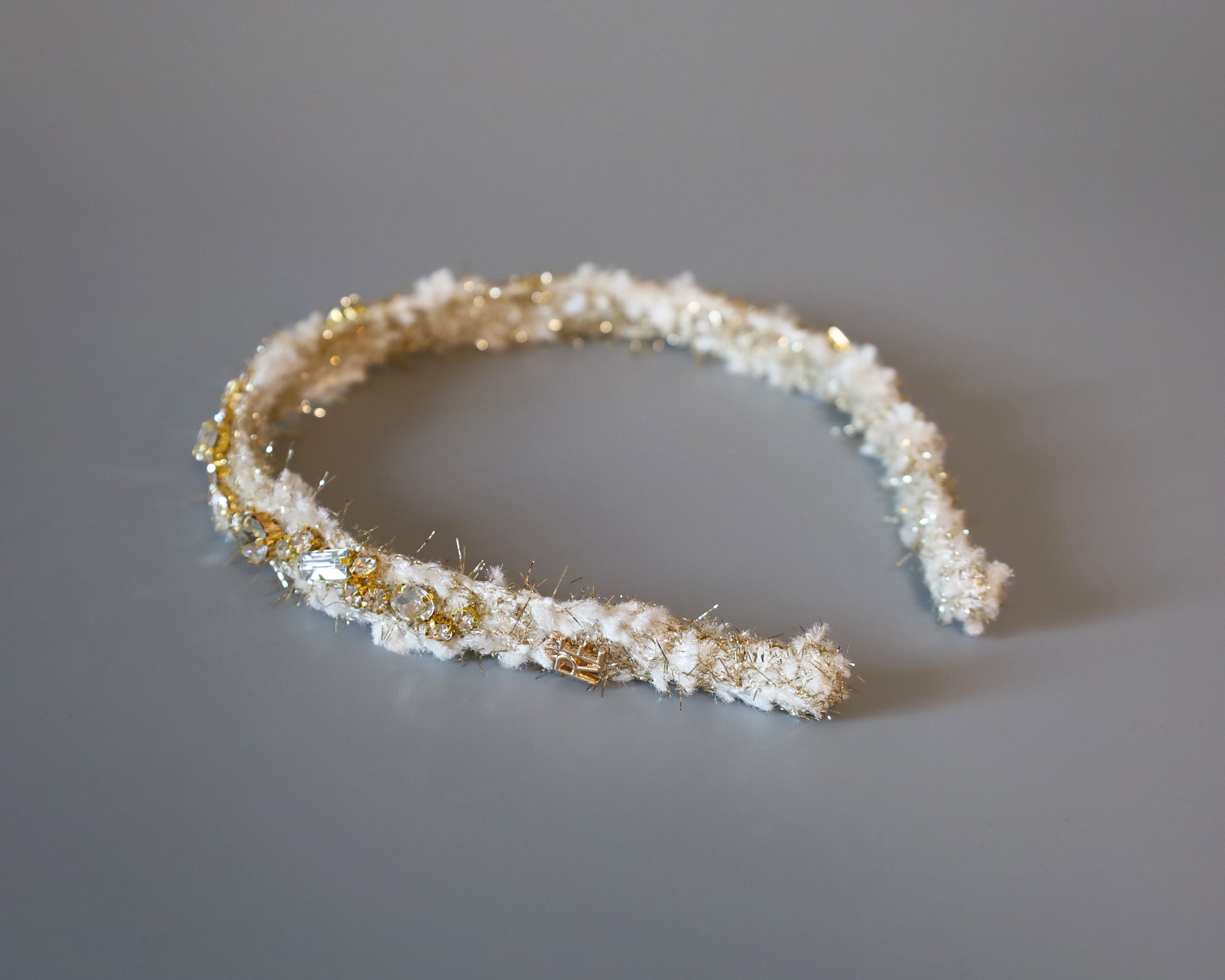 毛足長めのホワイト×ゴールドのツイードカチューシャ。