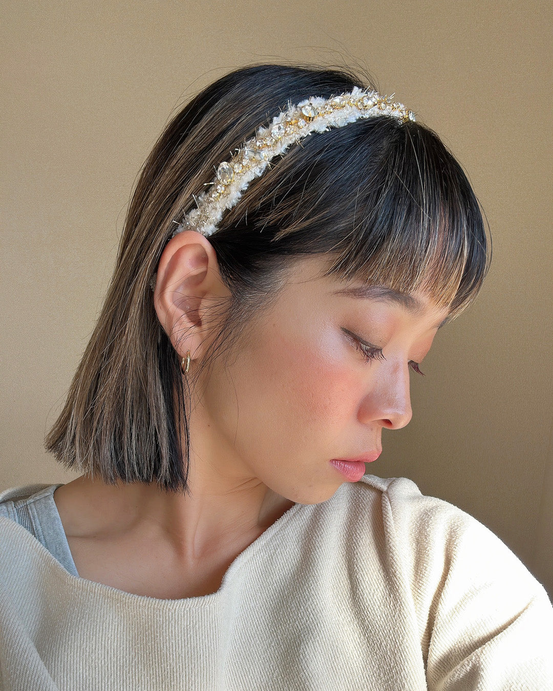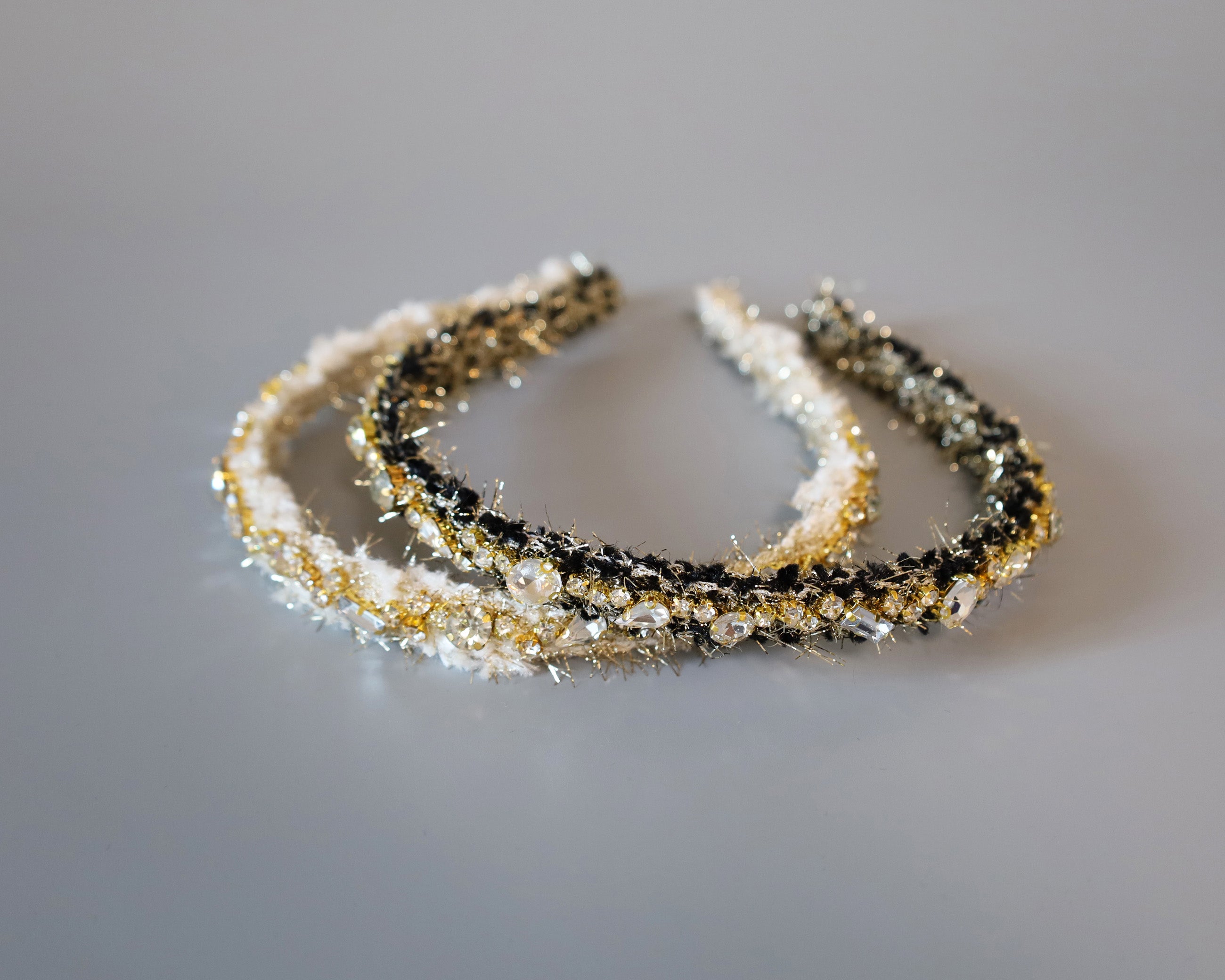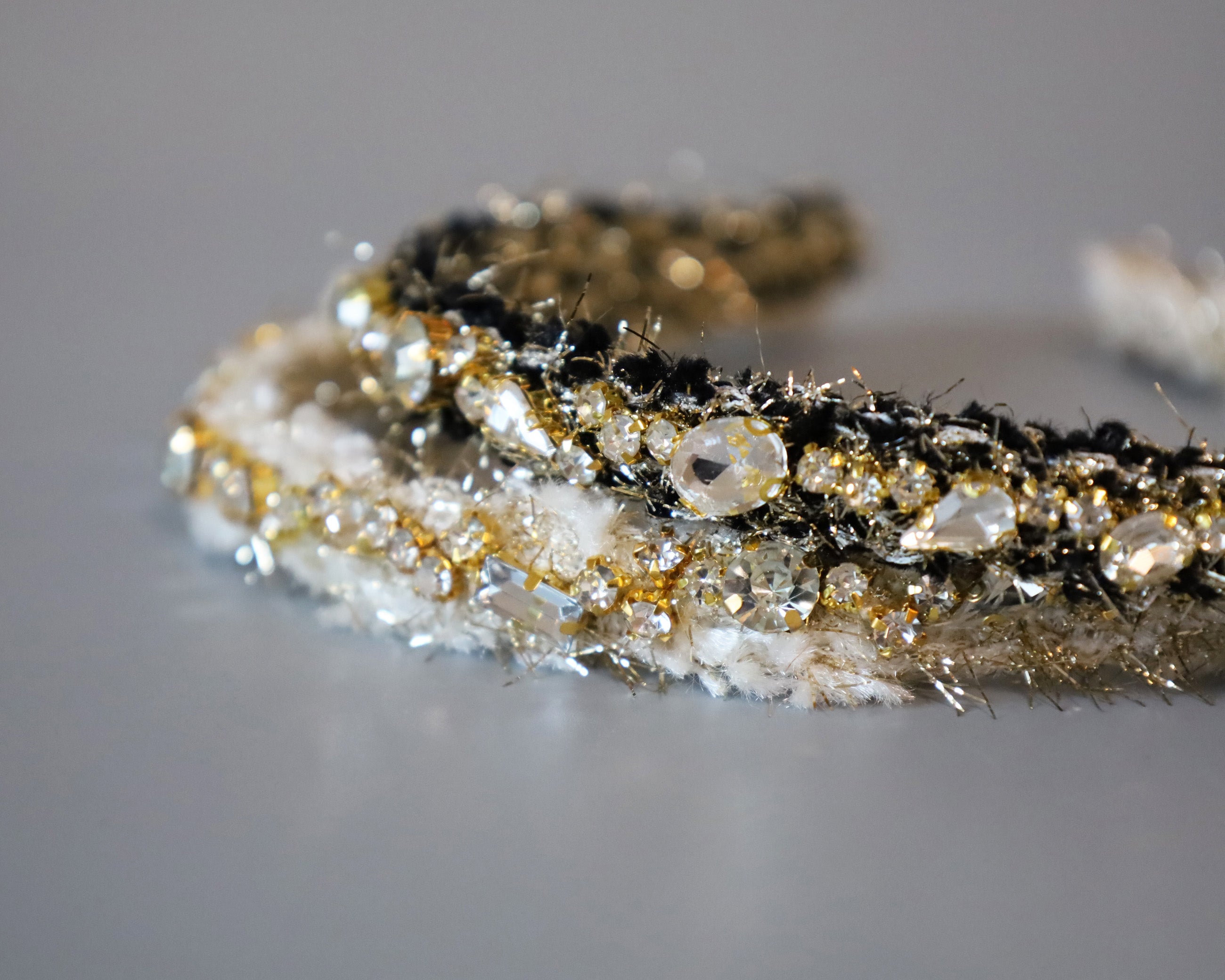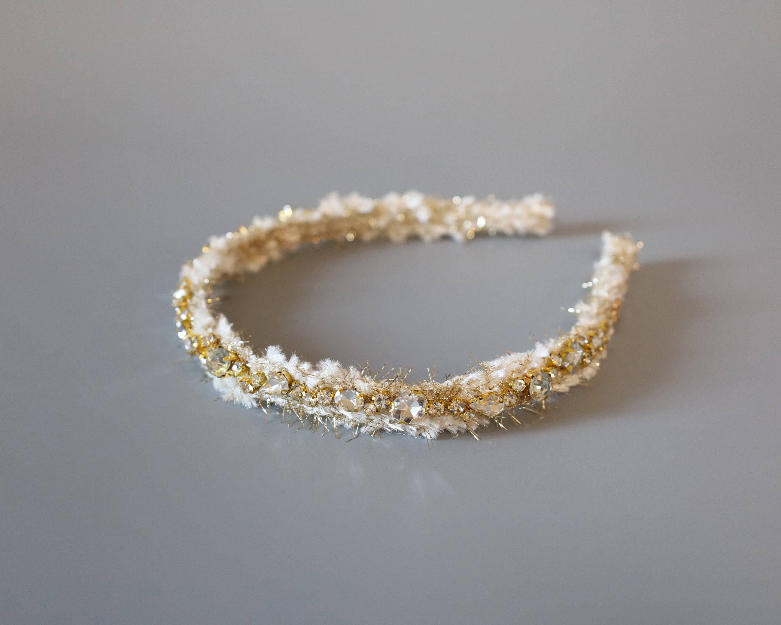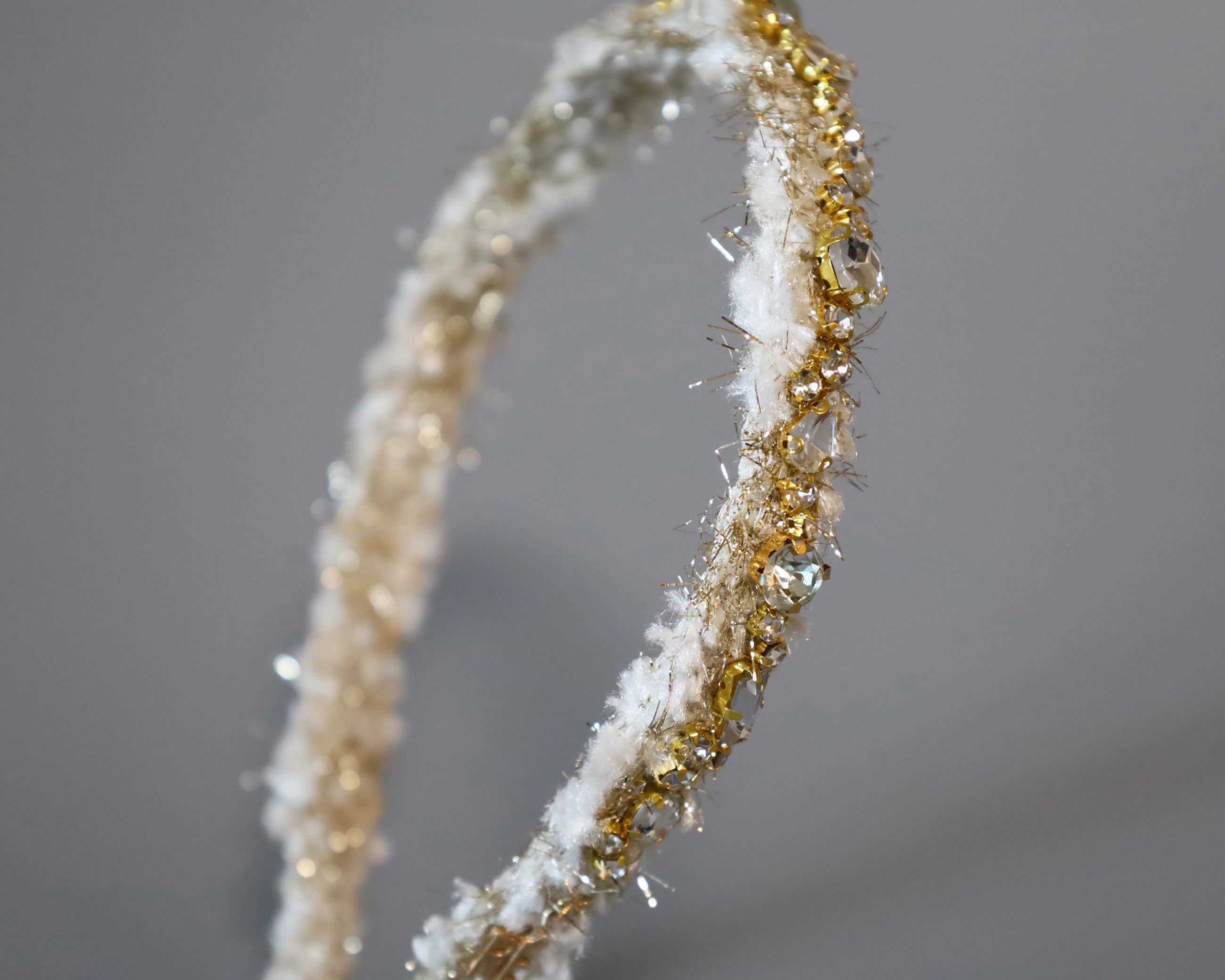 毛足長めのホワイト×ゴールドのツイードカチューシャ。